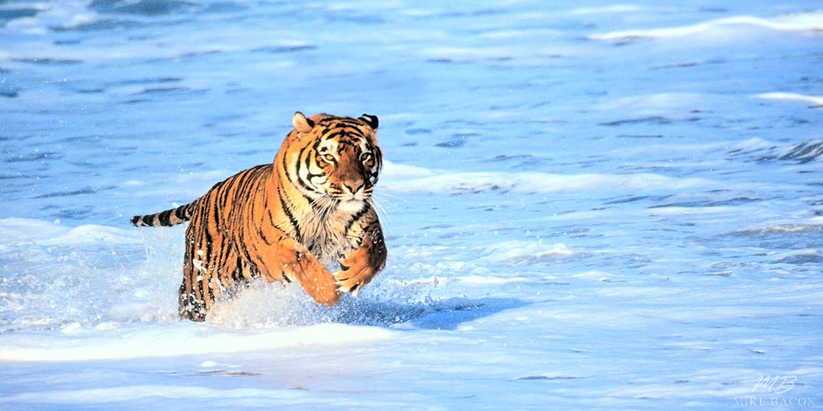 This stunning Tiger image is the culmination of many weeks spent traveling through out India in the hopes of encountering and photographing one or more of these magnificent animals. We had spent weeks along the Sundarbans, a cluster of low lying islands in the Bay of Bengal, spread across India and Bangladesh, famous for its unique mangrove forest and tigers. This delta region is among the largest in the world, measuring about 25,000 square miles. We had been living and sleeping in the land rover, hundreds of miles from nowhere, with all the comforts that no AC, no showers, torn and dirty backseats, roasted peanuts and canned fish could offer. Our home away from home, in an area that is the most mosquito and no see um, bug infested, mangrove forested swampland I have ever had the pleasure to encounter! But don't be fooled, Sundarbans in Indian means " beautiful woods", to whom I'm not quite sure, but what a trip and adventure we had! A trip of a lifetime you could say! By the time this photo was taken, we had observed and occasionally photographed this cat a half dozen times. On this morning, long into the trip, there was a tremendous thrashing and snarling in the underbrush and a few seconds later, out came a medium sized tiger, running towards us oblivious to our position, seemingly running for his life. He was being chased by this much larger tiger, and as they approached our land rover, they began to veer out along the edge of the Bay of Bengal instead of running right beside us. As they passed by, I shot off a whole roll of film and was rewarded with this wonderful image. I love the intense look in his eyes, paws out of water and tail straight out. This photo captured an awe inspiring moment! One that is sure to impress anyone when they see this image on your wall! On the shiny metal, he looks like he is going to jump right into your room! It looks AWESOME!