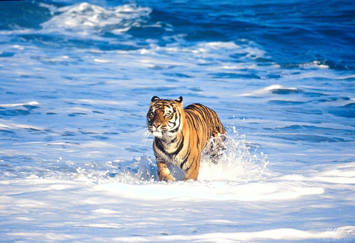 This stunning Tiger image is the culmination of many weeks spent traveling through out India in the hopes of encountering and photographing one or more of these magnificent animals. We had spent weeks along the Sundarbans, a cluster of low lying islands in the Bay of Bengal, spread across India and Bangladesh, famous for its unique mangrove forest and tigers. This delta region is among the largest in the world, measuring about 25,000 square miles. We had been living and sleeping in the land rover, hundreds of miles from nowhere, with all the comforts that no AC, no showers, torn and dirty backseats, roasted peanuts and canned fish could offer. Our home away from home, in an area that is the most mosquito and no see um, bug infested, mangrove forested swampland I have ever had the pleasure to encounter! But don't be fooled, Sundarbans in Indian means " beautiful woods", to whom I'm not quite sure, but what a trip and adventure we had! A trip of a lifetime you could say! By the time this photo was taken, we had observed and occasionally photographed this cat a half dozen times. On this morning, long into the trip, there was a tremendous thrashing and snarling in the underbrush and a few seconds later, out came a medium sized tiger, running towards us oblivious to our position, seemingly running for his life. He was being chased by this much larger tiger, and as they approached our land rover, they began to veer out along the edge of the Bay of Bengal instead of running right beside us. As they passed by, I shot off a whole roll of film and was rewarded with this wonderful image. I love the intense look in his eyes and the contrast of colors against the blue of the water. This photo captured an awe inspiring moment! One that is sure to impress anyone when they see this image on your wall! On the shiny metal, he looks like he is going to jump right into your room! It looks AWESOME!