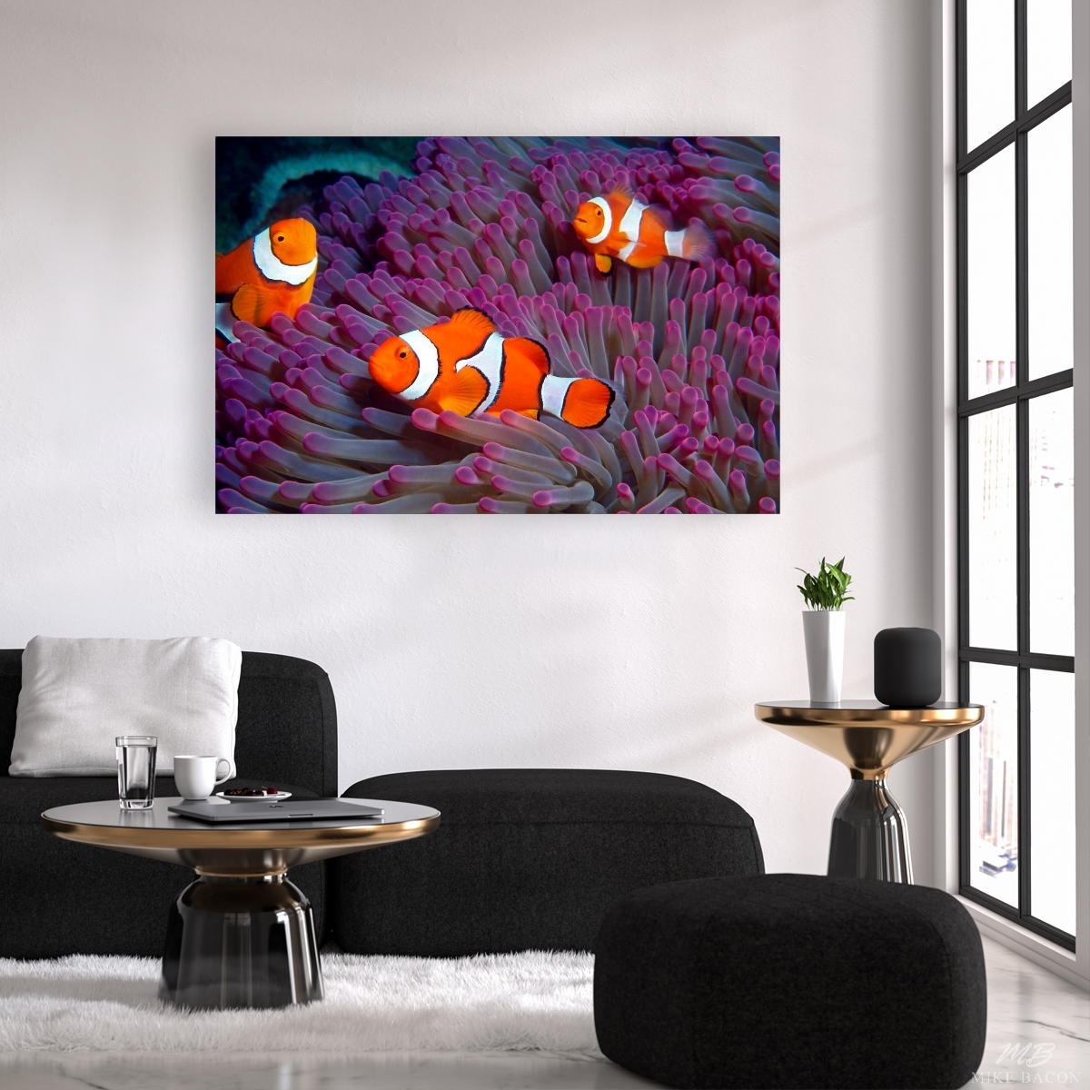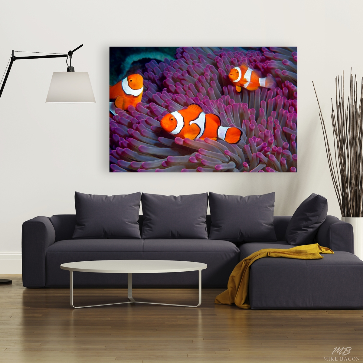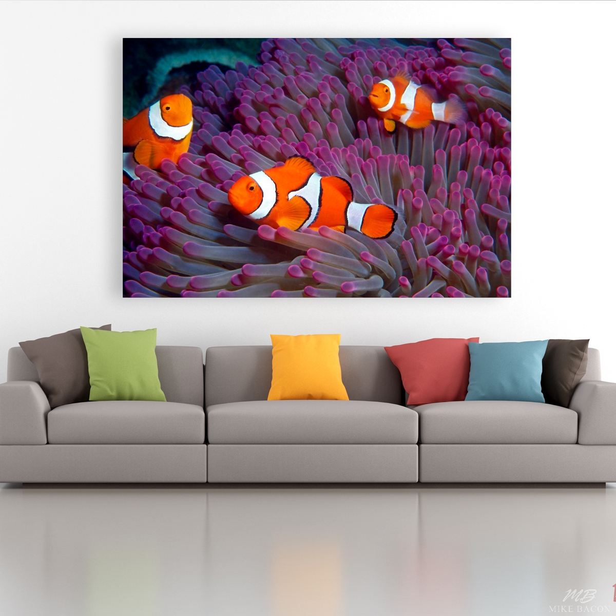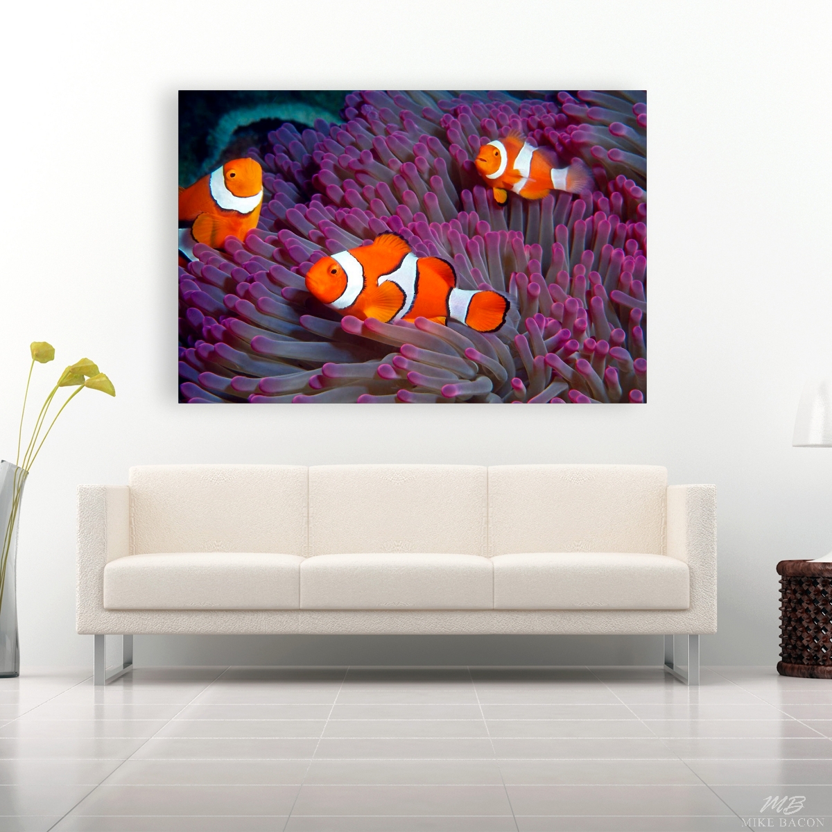I photographed this beautiful image of these three Percula Clownfish in Milne Bay near Alotau, Papua New Guinea. On this day we decided to do a little exploratory diving on a few of the offshore seamounts that were rarely visited by the local dive operations due to their remote locations. Am I glad that we did! On this one seamount in particular, almost every single Gigantic Anemone we found was an incredibly rich pink and purple color instead of the normal, greenish brown hue that we commonly found elsewhere. It was a wonderful discovery and by the end of the day, I had shot every roll of film I had brought along with me. I love the rich, deep pink and purple color of the very tips of the tentacles of this anemone along with the composition of the clownfish. The contrast of colors between the bright orange and white fish against the back drop of the flowing purple Anemone tentacles is visually stunning. Watching these three clowns swimming to and fro through the anemone and darting all around my camera lens was incredibly fun and visually entertaining. I loved every second of it!