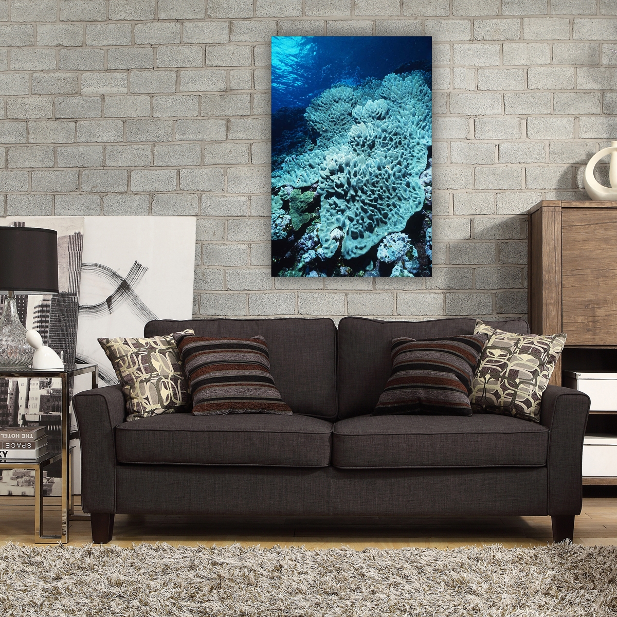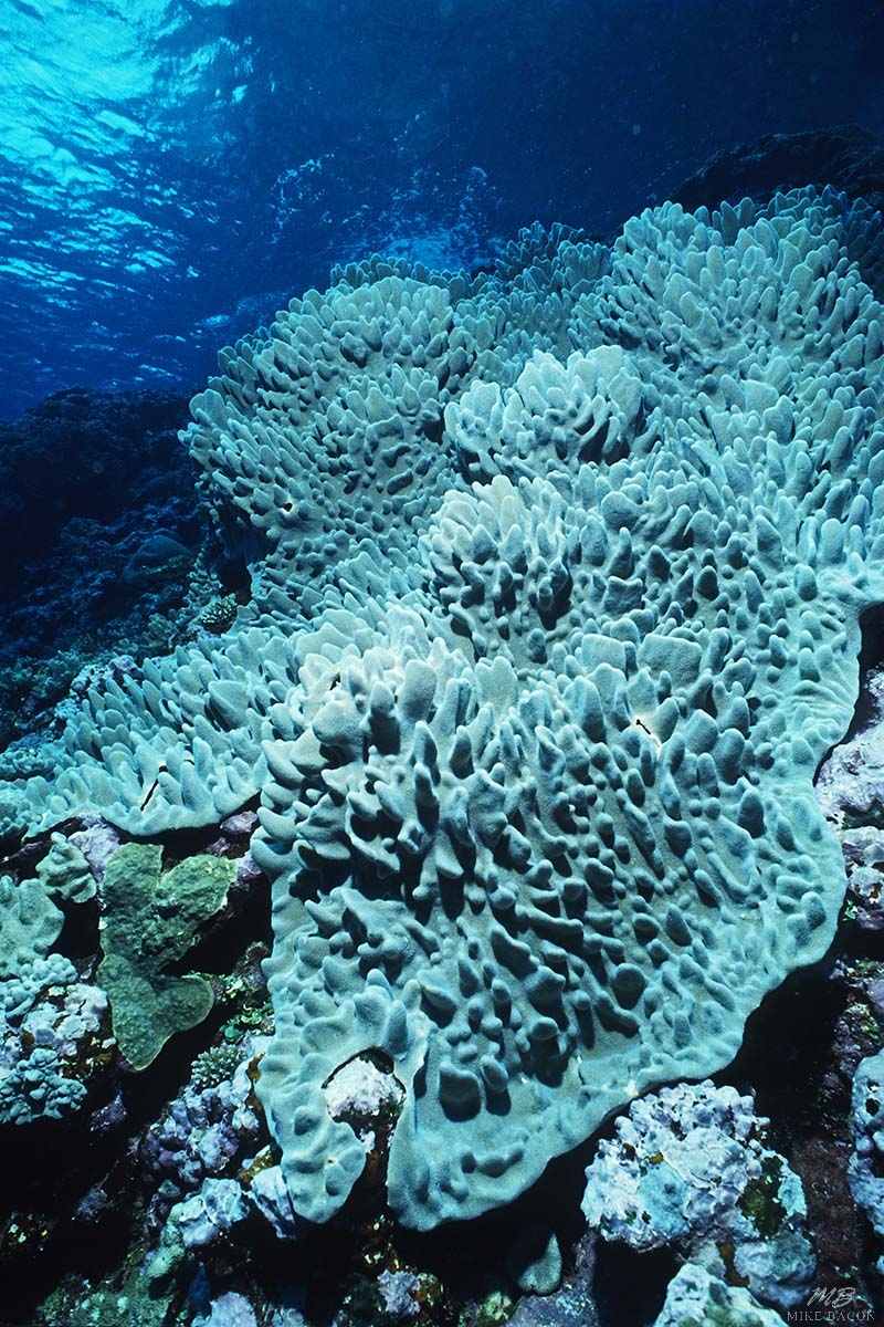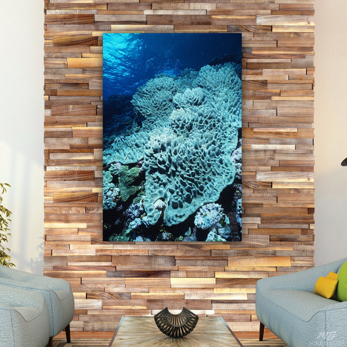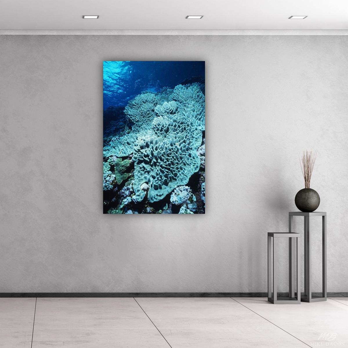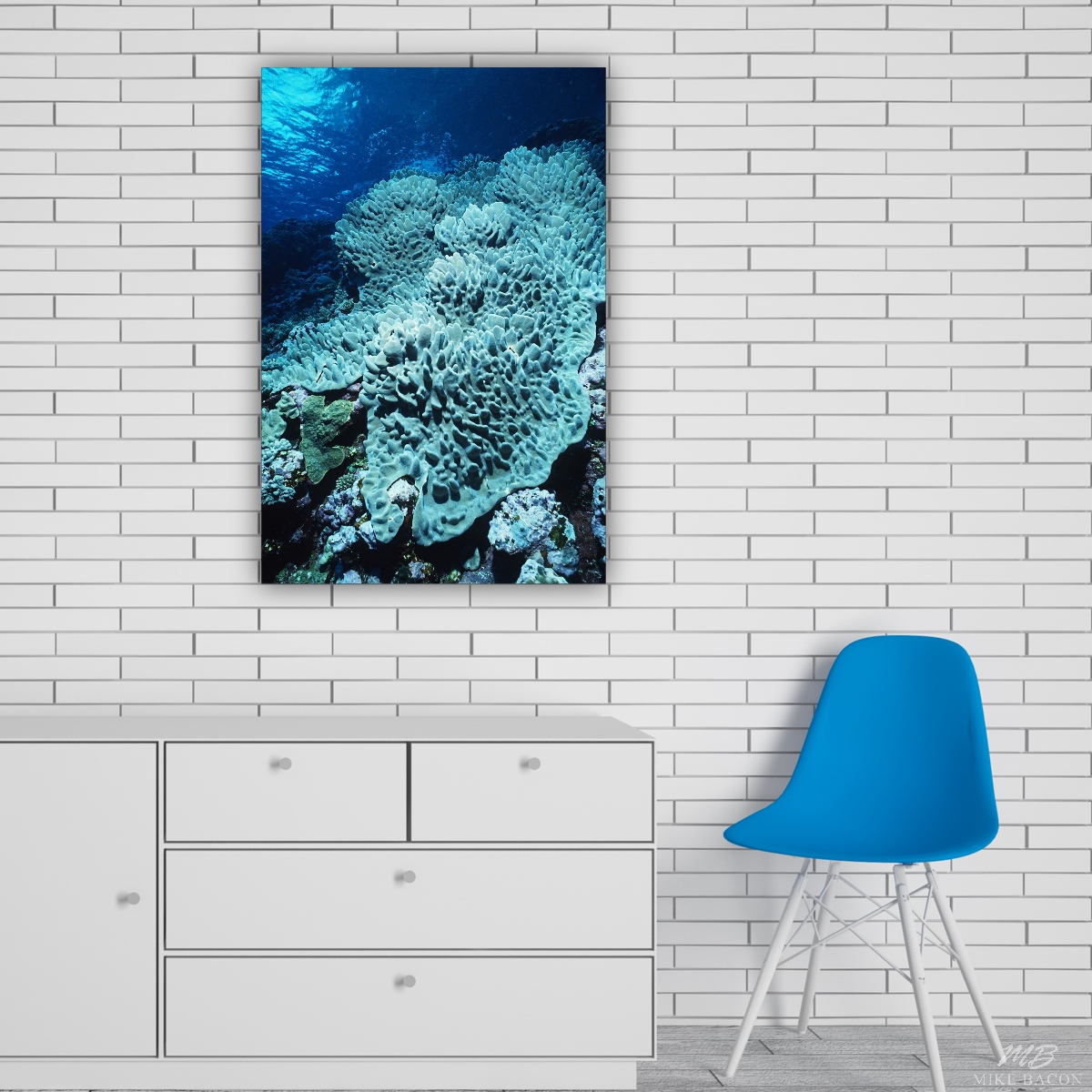 I love the peaceful nature and feeling of this image and the composition of the coral and how it had grown up from the depths almost the whole way to the surface. The incredible clarity of the water on this day will forever be hard to beat! Every time I look at this image, I wish I was still diving along the fringing edge of the reef, admiring the truly colossal corals that were abundant here. The color of the coral and the deeper blue water above go with everything in our house.