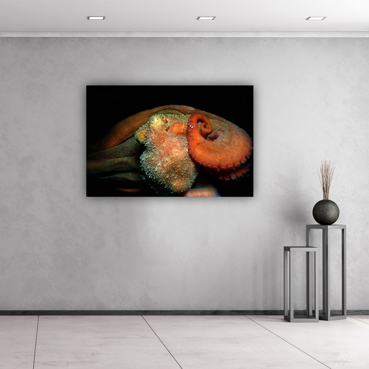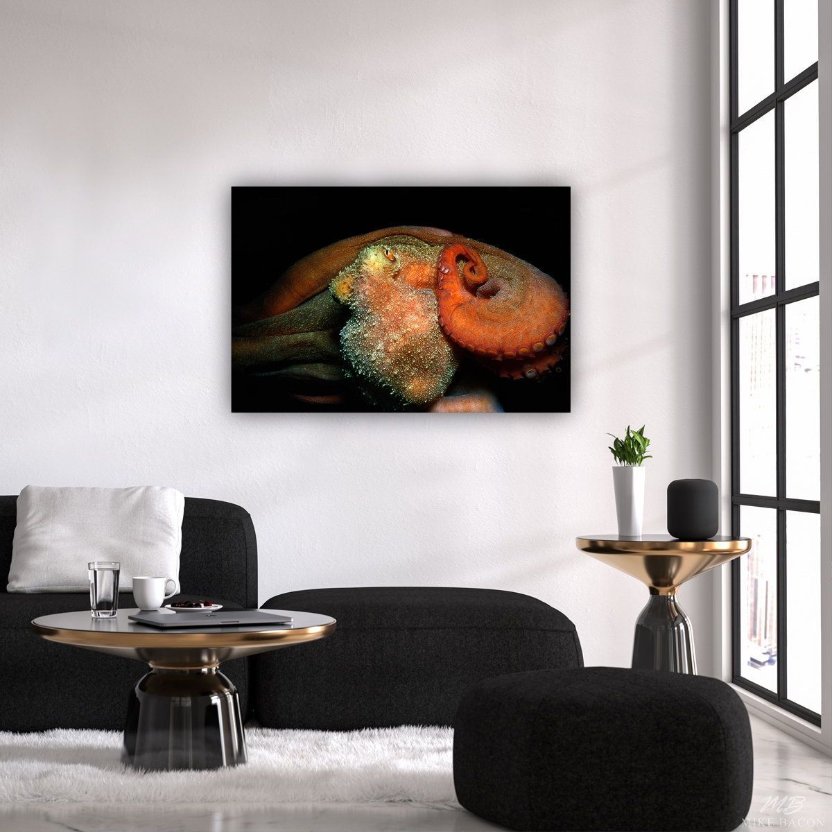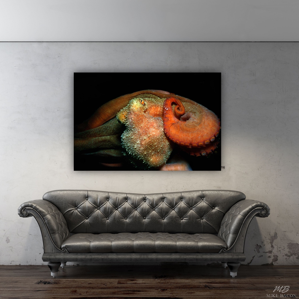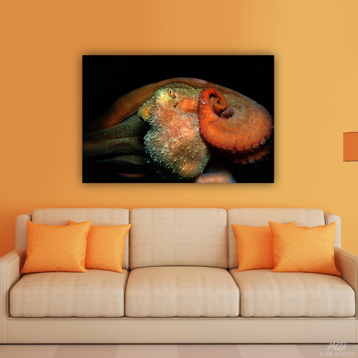 This large reef Octopus I encountered during a night dive underneath the Blue Heron Bridge by Singer Island, Florida. One of my favorite places to night dive, you never know what you might find or encounter there. She was out of her den, slowly crawling about, and as I moved my flashlight beam along the bottom, she would follow the light and grab every crab my light disturbed. I could tell she was acclimated to seeing divers as she was not spooked in the least by my presence. At times, she would snuggle right up to my lens and pose for me, as if begging to have her photo taken. I was happy to oblige and was rewarded with this image