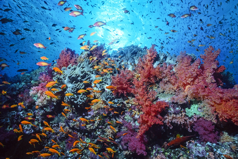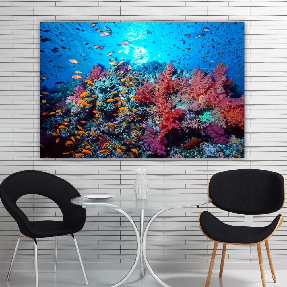 This beautiful photo of the vibrantly colored soft corals and brilliant orange schooling fairy basslets is a great addition to any room! It will lighten up the room and add an air of peace and tranquility at the same time. I took this photo on the north side of an offshore seamount in the Red Sea. This seamount, rising thousands of feet straight up from the bottom, is found hundreds of miles offshore of Egypt. It almost breaks the surface and is known for its incredible abundance of life. There is such competition for living space here that almost every nook and cranny has something living within it or on it. The beautiful blue water with its incredible clarity, and the pastel colors of the reef make this image a great addition to any home!