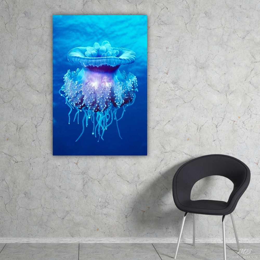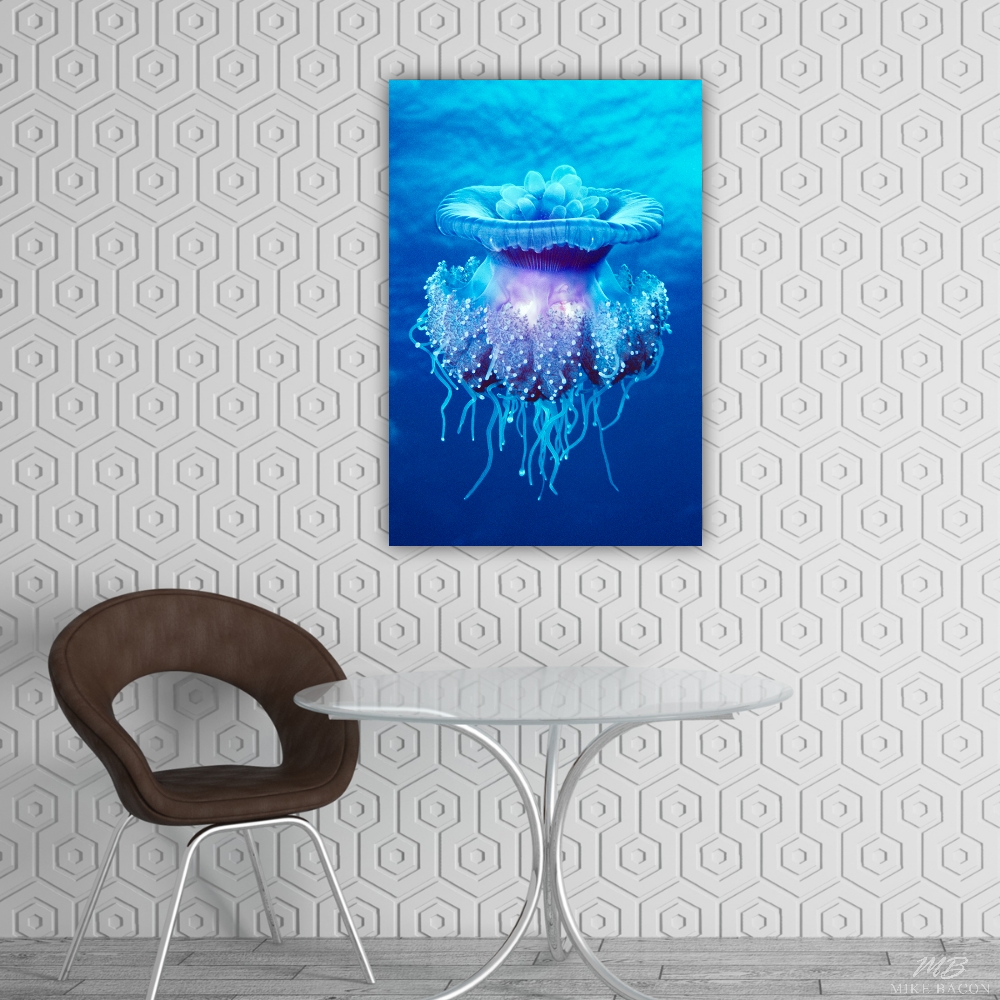 This crown jellyfish photo is one of my all time favorite underwater photos! I love the way it stands out against the deeper blue of the ocean, how the 'eyes" glow along the edge of the cap and the way the tips of the tentacles and central frill seem to radiate light from within. Needless to say, "It speaks to me" and to others as well! This is a medium sized jellyfish that I photographed at a depth of about 155 feet on the backside of a desolate sea mount hundreds of miles offshore in the Red Sea. A place where up welling currents were sweeping up from thousands of feet of water, up and over the top of the sea mount and sweeping these jellyfish past me. I could see them rising from hundreds of feet, up from the blackened depths below, glowing orbs of light like miniature flying saucers traversing thru the realm of inner-space and past my lens. To say I thought they were "out of this world" is an understatement! I know this photo will look awesome on your wall and capture the attention of all who enter. How do I know this you ask? Because it is on our wall too!
