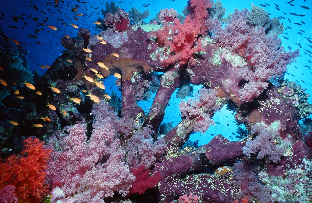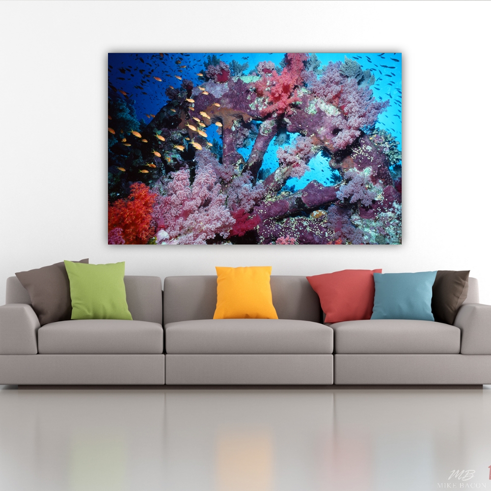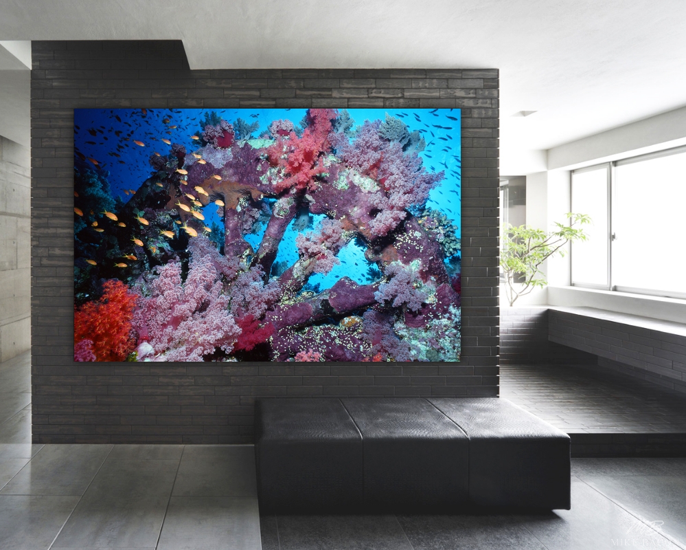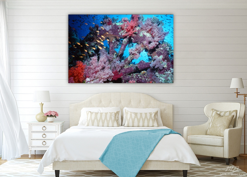 I took this photo of this soft coral encrusted ships wheel surrounded by orange fairy basslets on an incredible reef called Big Brother's island off the coast of Egypt in the Red Sea. This is from a wooden schooner that sunk sometime around the 1890's and was re-discovered in the early 1990's. We were among those first to dive it and I consider this place to be one of my all time favorite dive sites. As multiple ships and schooners sank over the years, the corals grew so fast that they would literally preserve the vessels in a living coral reef. A site to see! It has been sometime since I last was there. I hope it is still the same! This reef is a sea mount that comes up from thousands of feet of water in the very middle of no where. On top of the reef it is about 4 feet in depth, just a short distance to the west of the reef wall it drops off to several thousand feet. The top edge of this reef is covered with tremendous giant anemones with dozens of clownfish, huge brilliant red, purple and pink soft corals and clouds of brilliant red and orange fairy basslets swimming everywhere. It is also home to the largest manta ray, whale shark and oceanic white tip shark I have ever seen in my entire life of diving! The word "Gigunda" came to mind when I saw them and I had just come from the silver banks photographing humpback whales underwater and I was used to seeing BIG things! The rocks just breaking the surface are covered by thousands of clinging, multicolored mud skippers that look straight out of a Dr. Zuess novel, that jump from rock to rock to get away from you. Only fish I've ever seen that jump out of the water to get away, instead of jumping in the water to swim away. Let me sum it up like this, in other words, an underwater photographer and nature lover's paradise! As you swim out over the edge and look down, the incredible clarity with hundreds of feet of visibility makes you feel like you are almost parachuting into the depths. This type of drop off gives "wall diving" a new meaning! And speaking of walls, the peaceful nature of this image, and radiating blue water with the sun in the background, looks perfect in any room, and has an awesome story to go with it!