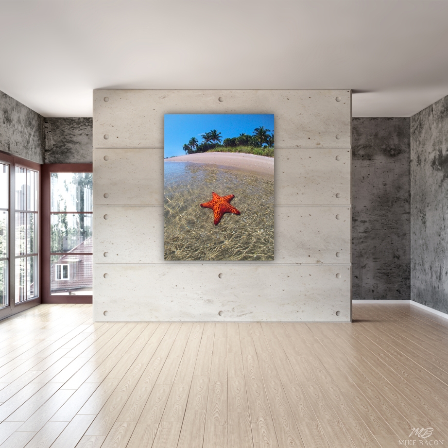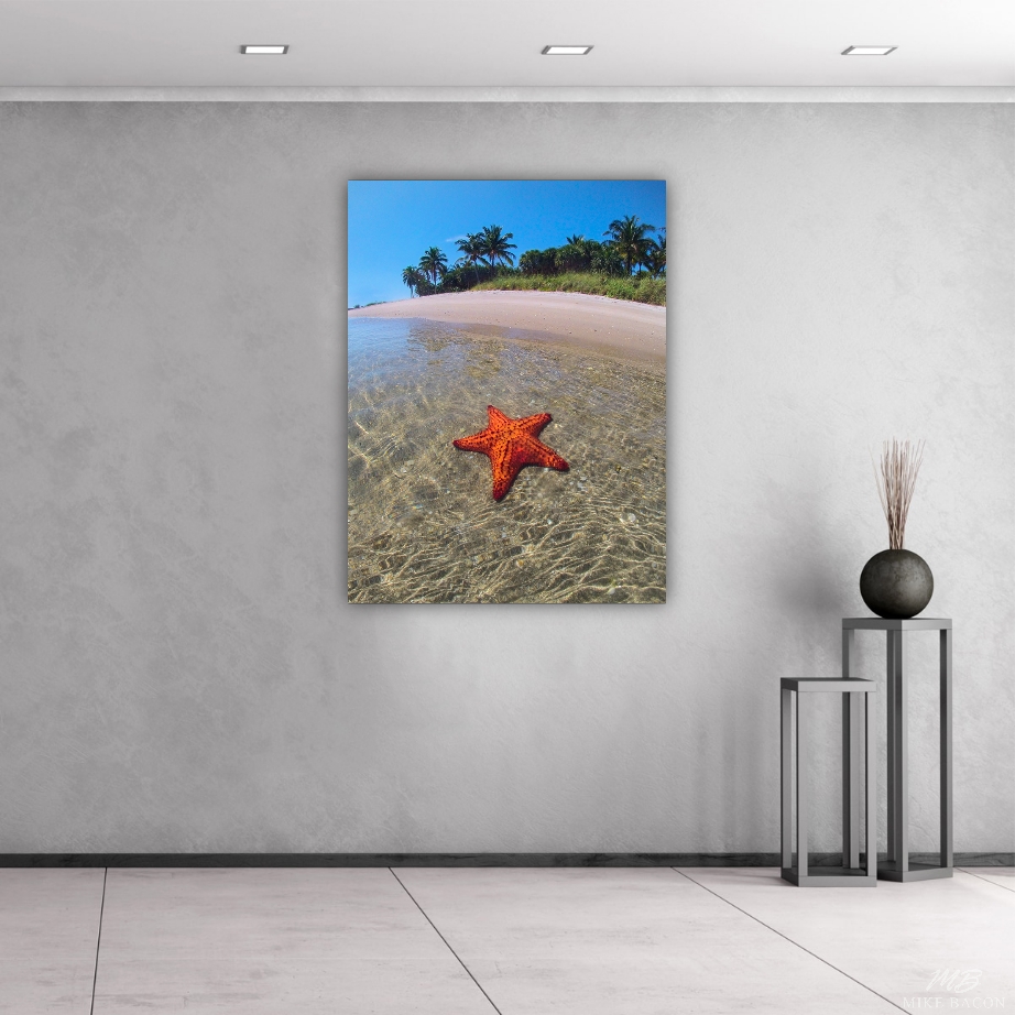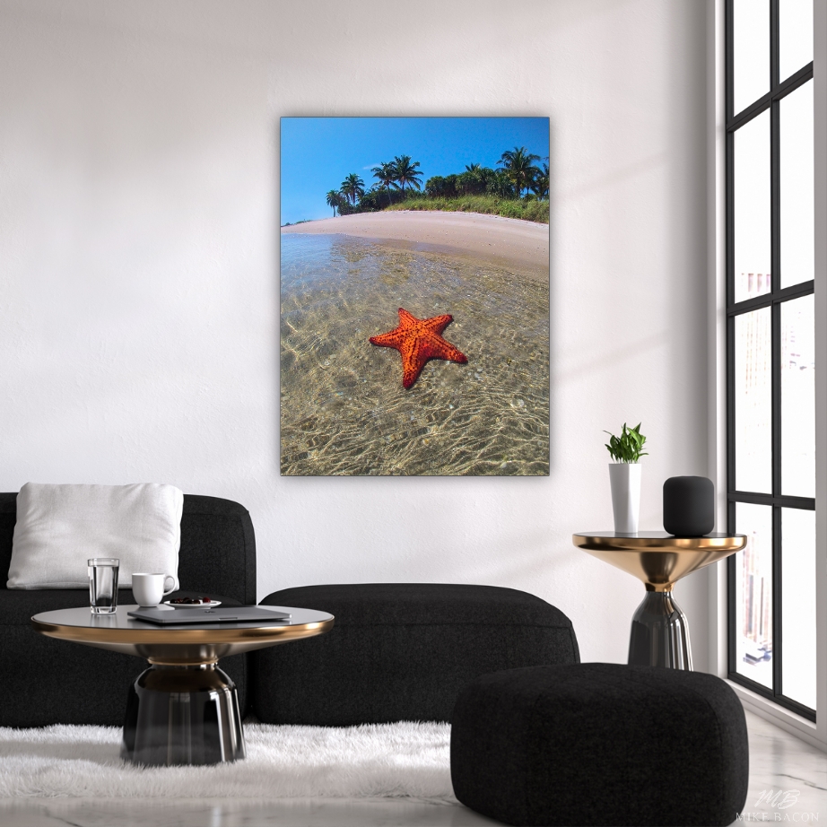 One morning, while leading my AdventureMike's Summer Camp for kids, we came upon a beautiful and extremely large cushion starfish in the shallows by Peanut Island. I loved the contrast of the brilliant red starfish against the shells and sand with the palm trees in the background. Cushion starfish are the largest starfish found in North America and rare enough that they are a protected species here. I took a few quick photos and we continued on, hoping to find another. If you need to add color and a peaceful image to a room, then this is a good choice.