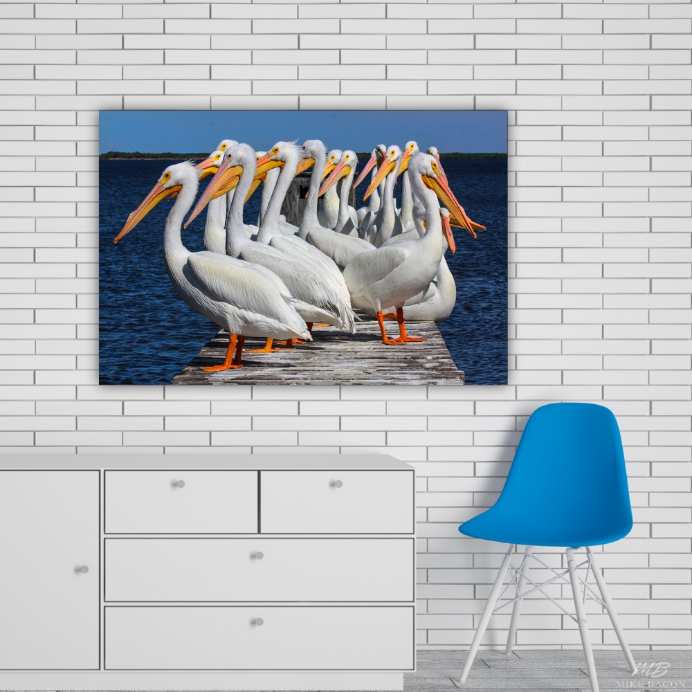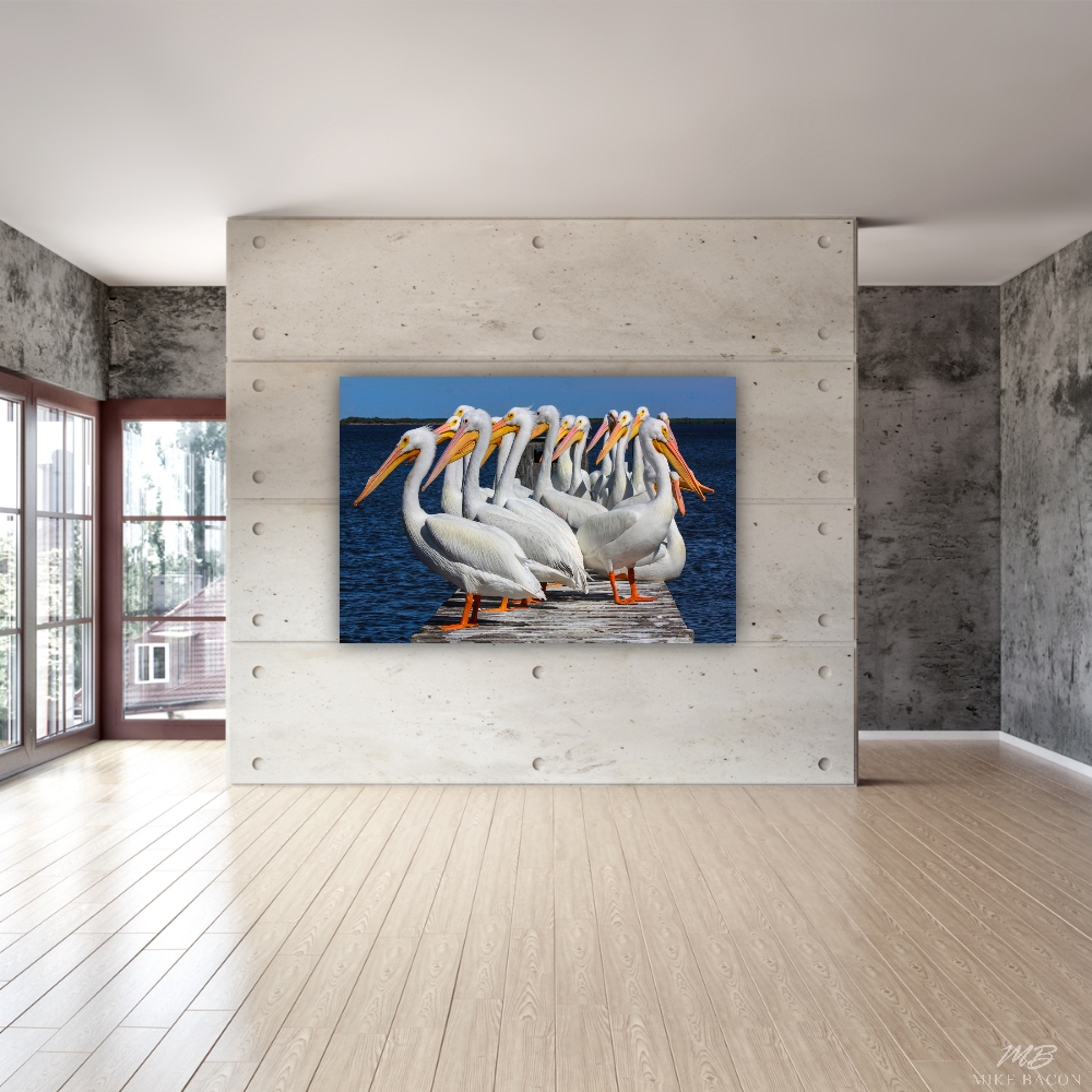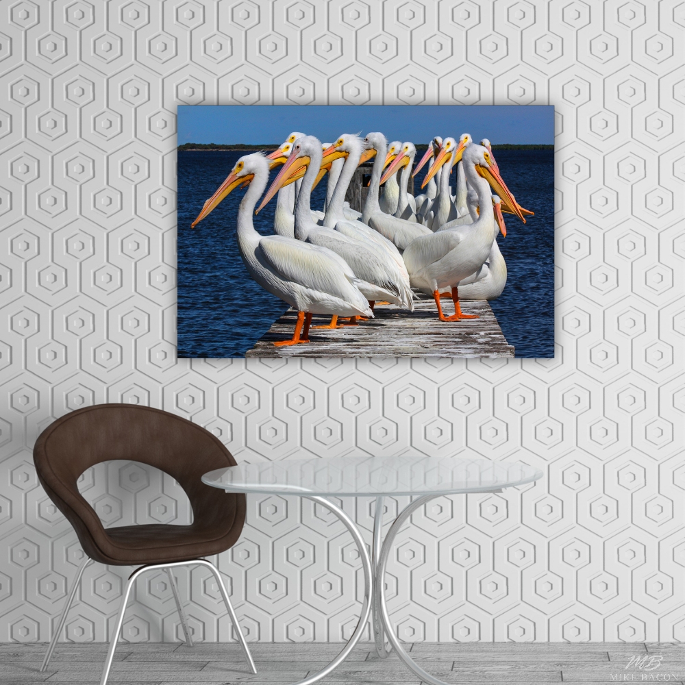 I had been trying for many years to get some nice shots of white pelicans, and this past Fall my efforts and energy finally paid off. To say the least, I am extremely happy with this photo. I love the composition of the pelicans evenly spread along the dock. The white pelican is one of the largest winged birds in North America and spends most if its life in the northern reaches of Canada. Beginning in early Fall they migrate south to Florida and beyond. During this time it is the breeding season and the feet and bills become a bright pinkish orange. When sexually mature, the white around the eyes turns yellow and the males grow a raised knob on their bills they use in sparring over females. At the end of the season, the knob falls off like a deer antler. They begin to head back north around mid February and early March. One early morning in November while driving up the coast, I saw this tremendous flock of white pelicans land on a nearshore barrier island. When I got to the spot, I pulled over and watched them for over an hour, wishing I had a way to get out there and take photos. I couldn't think of any better option short of swimming and that wasn't going to work carrying some large, expensive and heavy telephoto lenses over my head in salt water. I did consider it though rather seriously! Somewhat discouraged, I got back in my van and continued to drive on, thinking I'm never going to get the opportunity I so desperately wanted. Little did I know then that 2 miles up the road my luck was about to change! I came around a bend and there in front of me, parked along the water was a white van with a couple kayaks on top and a little hand painted sign that said,"kayak rentals". I was in luck! Three days later I was rewarded with this image when I was able to sneak along the mangroves and crawl belly first down someone's dock and compose the image the way I wanted. Just as I reached the edge of their comfort zone, they all stood up, faced me perfectly. I quickly shot a few images and then watched as they launched into the air and disappeared from view around the bend. It was an incredible sight to behold. If you are a pelican lover like me, than this image is meant for you! I can't help but smile every time I look at it. You will too! This photo will give your room the added touch it needs.