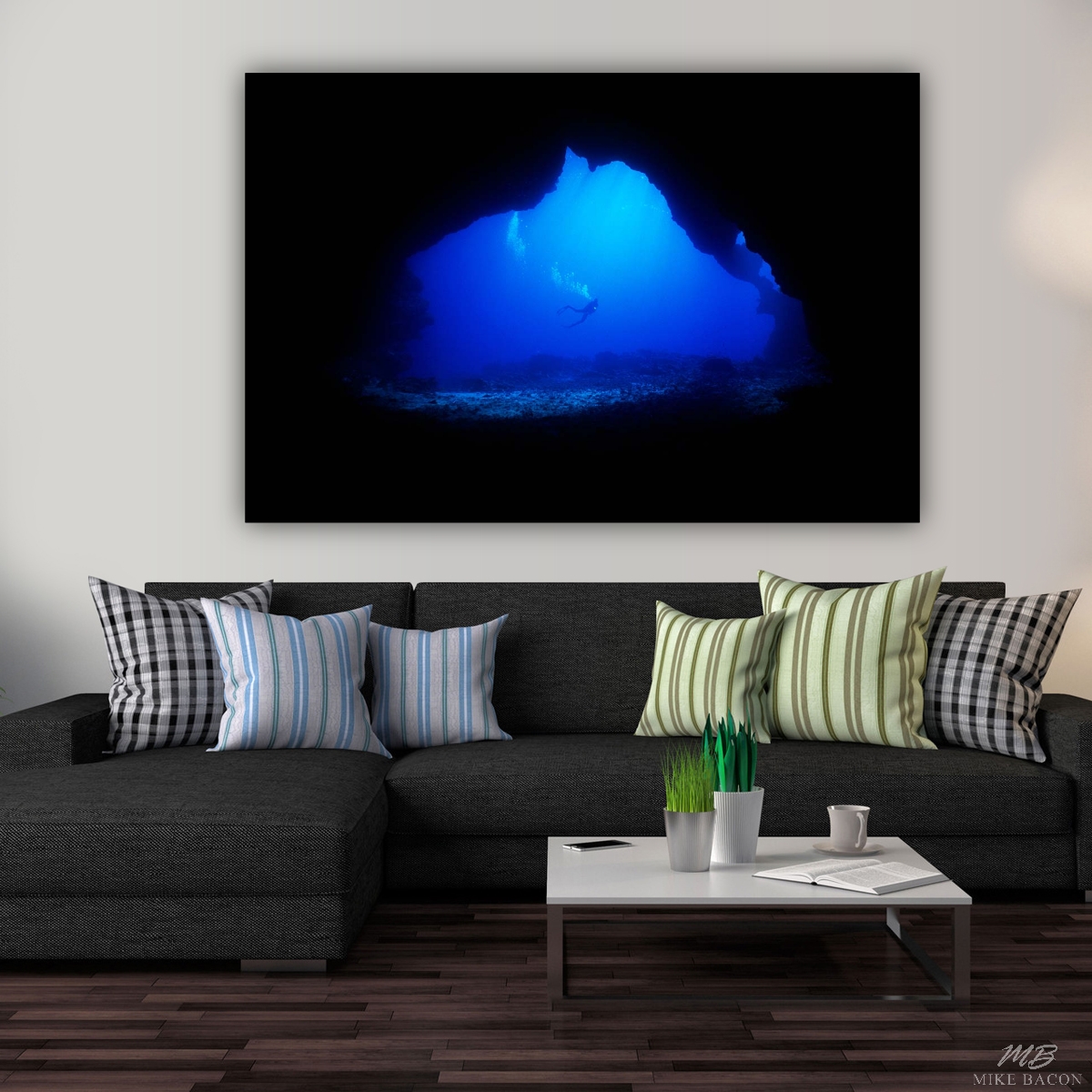 This photo of the scuba diver passing in front of the entrance to this magnificent cave in Tonga has always enthralled me. The lit flashlight pointing in my direction is an additional bonus that gives this image a wonderful focal point. This cave was the largest I have ever encountered while diving and seemed to go on forever as it dropped off into the depths. The further I explored back into the cave, the more immense it became. The entrance had to be close to 80 feet in diameter, and began at a depth of around 60 feet. This cave can only be entered or explored during periods of slack tides. When the tide changes, the currents suck into this cave well over 10 miles per hour and a diver could disappear for good if not careful and aware of what is happening. I love how the diver is centered in the image, surrounded by deep blue water, and totally framed in total blackness by the most awesome cave entrance I have ever seen. This photo has an awe inspiring feeling to it when I look at it on our wall.