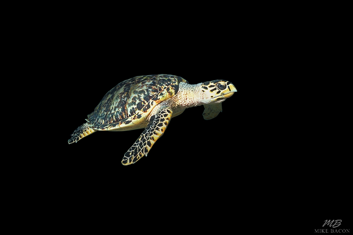 I took this photo of a Hawksbill Sea Turtle in the Bahamas while enjoying a wonderful night dive on the Sugar Wreck, north of Grand Bahama Island. This curious turtle followed me all around the wreck and every time I looked over my shoulder it was there as if expecting a lobster handout. I truly enjoyed the company and by the end of the dive, I felt some what attached to this turtle. It was one of the best dive buddies I've ever had and kept me company through out my dive..