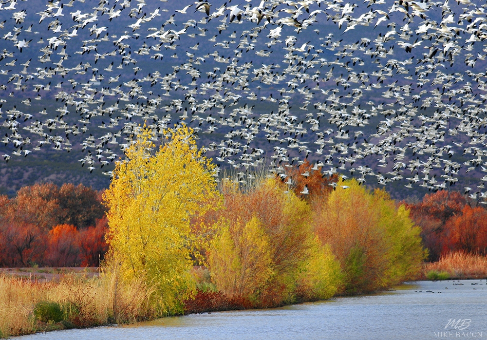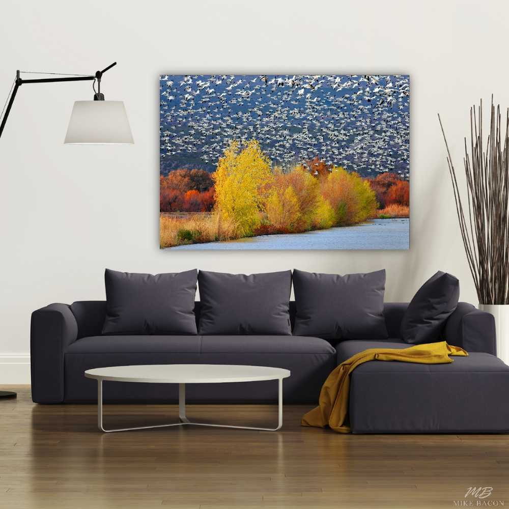 This incredible photo is the culmination of many years and countless hours spent in Bosque del Apache, New Mexico photographing the snow geese as they migrate south in the Fall. On this year tremendous rains flooded the nearby valleys where they had been growing grain and the moist conditions through out the Fall allowed the leaves to stay on the trees longer, giving them a chance to change to full colors. A rarity here! Over the next few weeks, the abundant food brought the snow geese in by the hundreds of thousands. On this morning, a storm over the mountains forced the geese to fly low along the valleys through the trees, instead of normally a mile overhead. I had been standing in awe watching as this non-stop, flowing river of honking birds passed overhead, when, without warning, a single ray of light peeked through the clouds, magically lighting only the geese and trees in the foreground and leaving the sky and background still dark. The impact of the stark white geese against the dark sky along with the brilliant warm colors of the trees in the foreground gives this image a "WOW" factor that would be impossible to repeat! Add to that the sound of hundreds of thousands of geese all honking at the same time, is a memory I hope to never forget. If you need a beautiful and stunning image on your wall that will stand out and make a statement, and impossible to stop admiring, than this is the image for you! I can almost promise you, your neighbors will be jealous they did not see and purchase it first!
