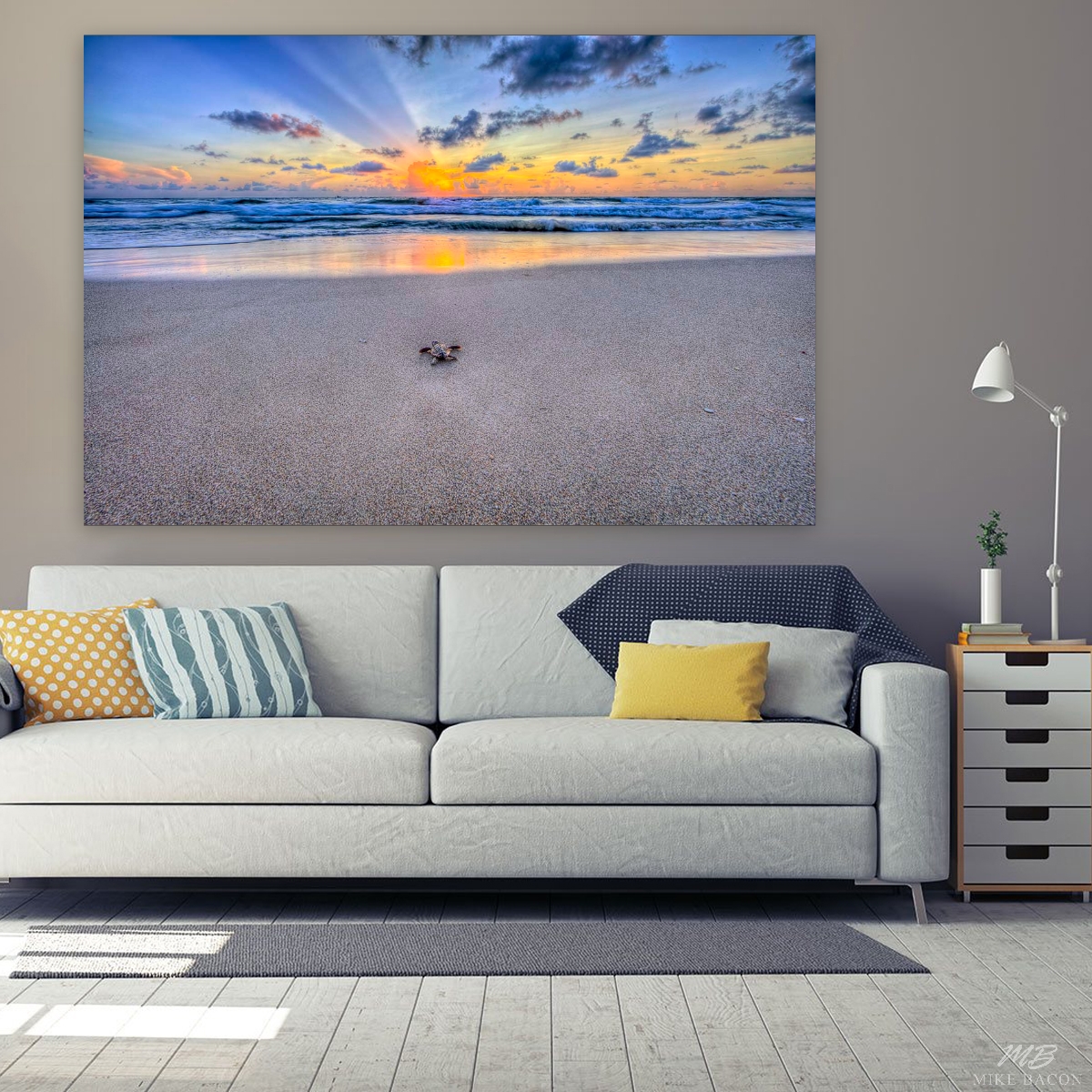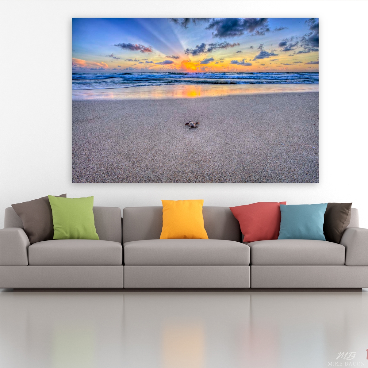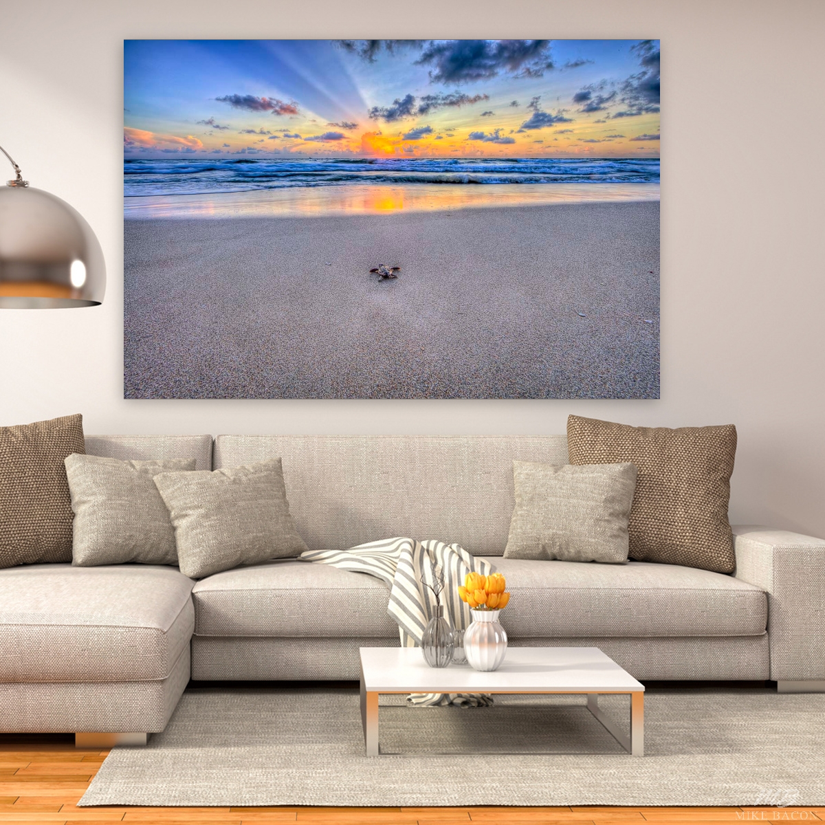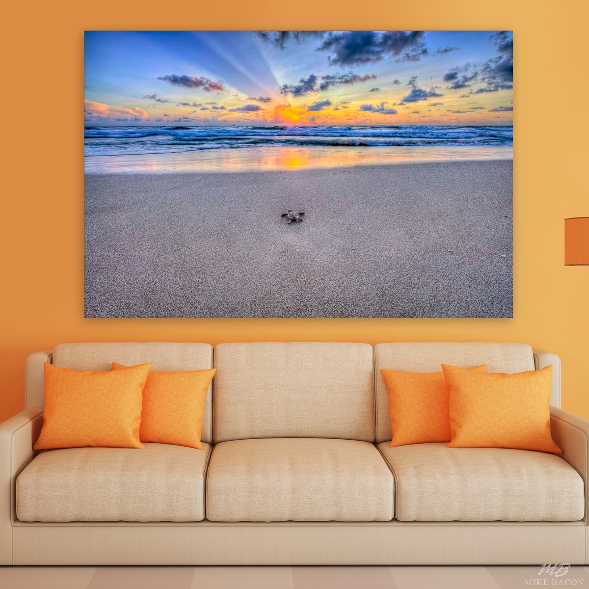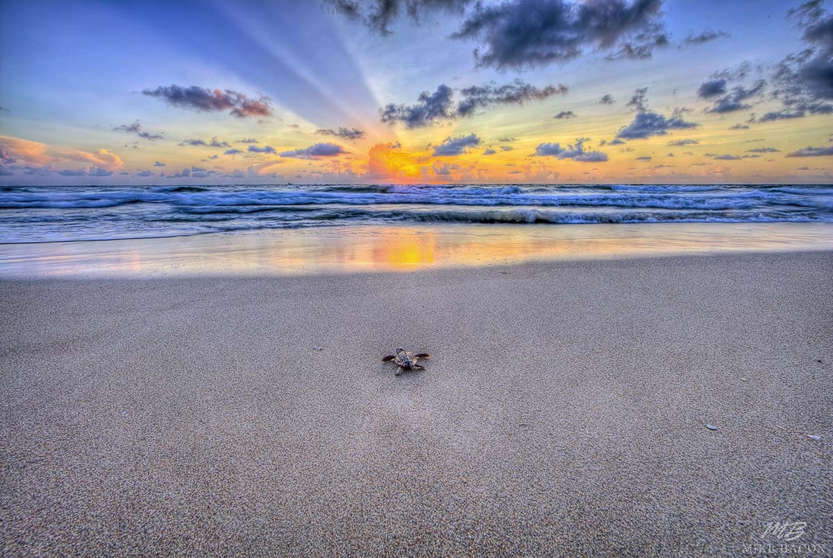 I have been trying for many years to capture some really awesome photos of sea turtle hatch-lings making their way down the beach at sunrise as they begin their life's journey out at sea. I had been walking the beach daily this past Summer when all my cards came together! In early August I was incredibly lucky and fortunate in this endeavor, and I was finally rewarded with some images that far surpassed anything I had envisioned! This image is very similar to the one I titled "Oceans Call" but was taken the very next morning a few hundred yards to the north. The tide was a good bit lower. The story and circumstances are basically the same, but the dramatic rays coming out from behind the clouds and the brilliant orange reflections on the wet sand in the foreground gives this image a different feel that is equally beautiful and stunning in its own right! The stark contrast of the rays against the sky adds another dimension that I truly love! On the shiny metal this image