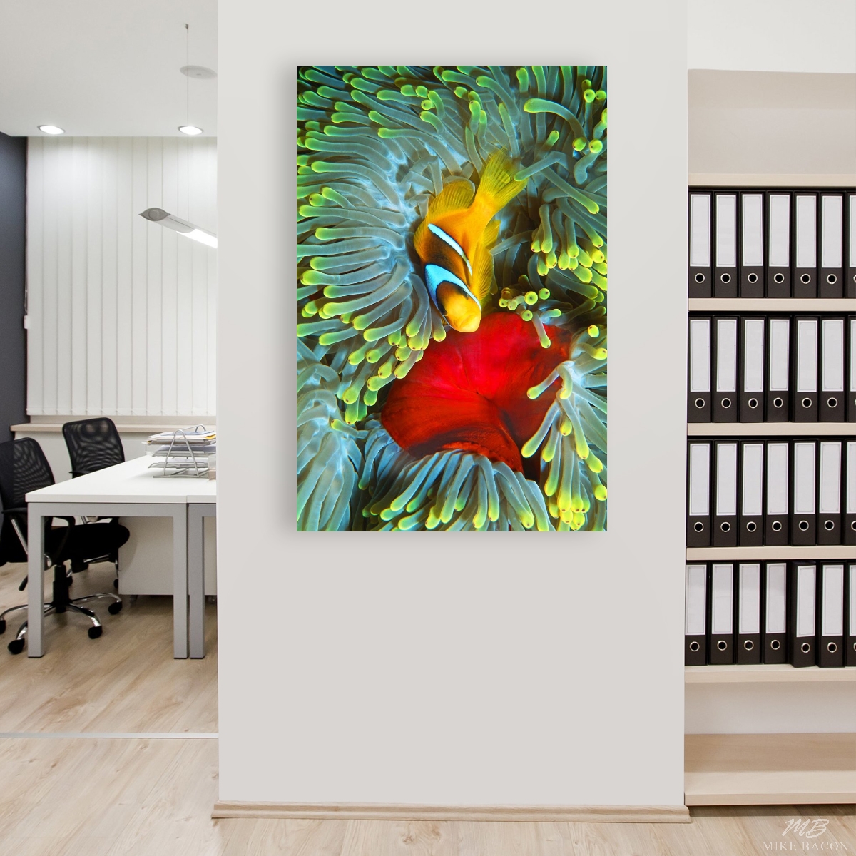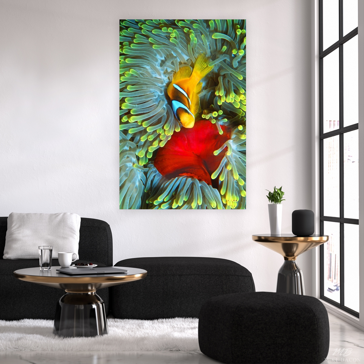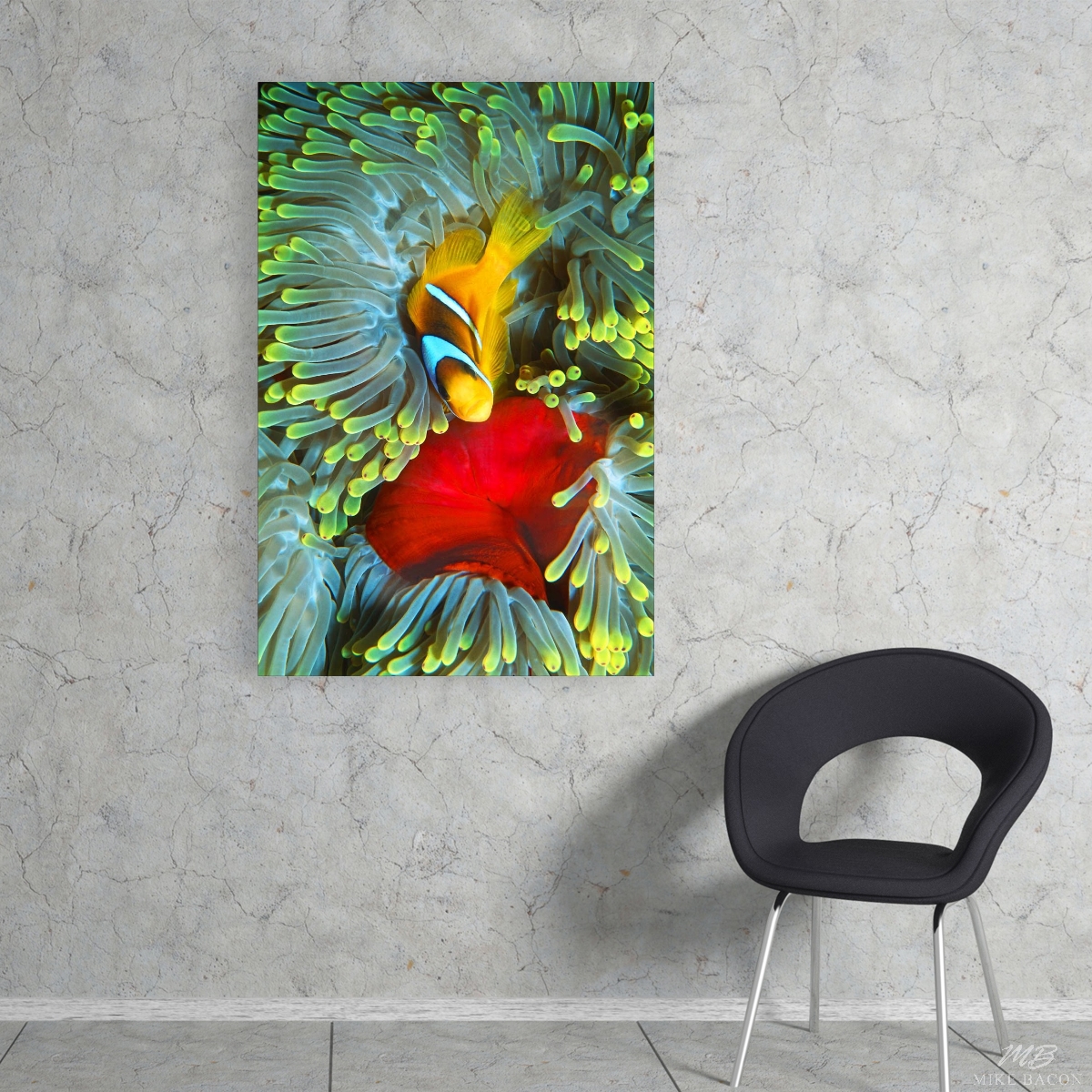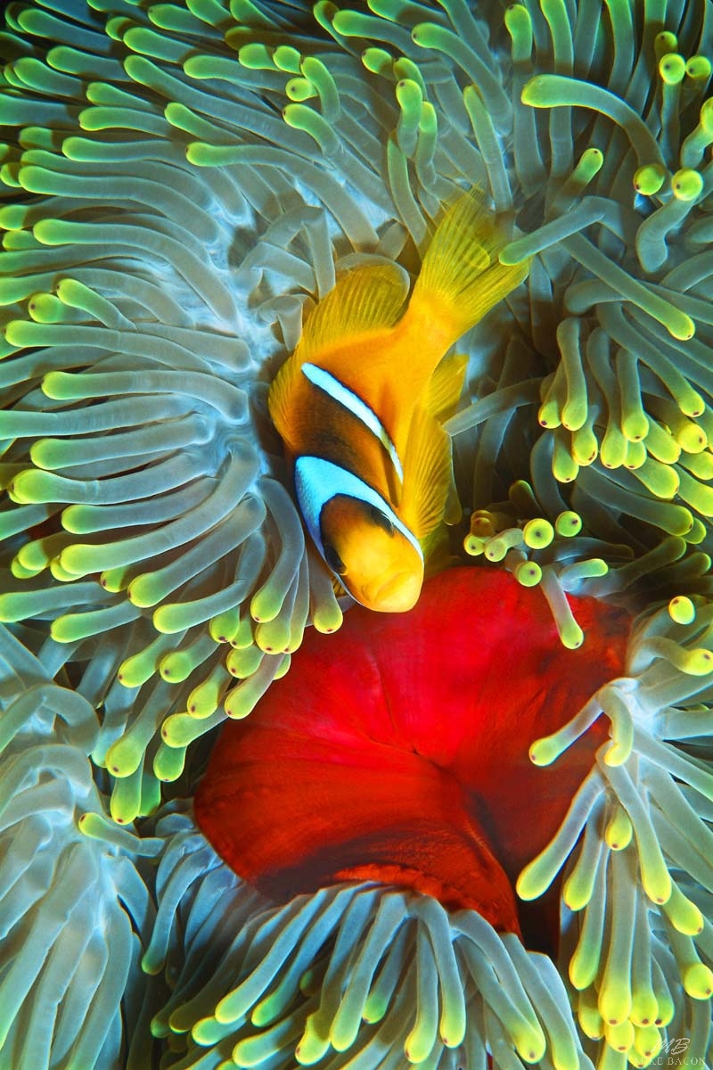 This beautiful image of an adult female Orangefin Anemonefish was photographed on the north side of Big Brothers Island in the Red Sea. Big Brothers Island is a desolate sea mount hundreds of miles offshore of Egypt where up welling currents sweep up from thousands of feet of water and over the top of this sea mount. These up welling currents bring up incredibly clear nutrient rich water and the whole top edge of the seamount is covered with immense, brilliant red, gigantic anemones. Add to this beauty, hundreds, if not thousands of Orangefin Anemonefish all swimming and dancing through the currents and swaying tentacles of the anemones. What a "WOW" factor to behold! In very short order, you will find yourself mesmerized by the array of vibrant colors and by the myriad schools of fish in every color of the rainbow, all swimming around you. If you learn to dive here, you have started with "desert" first and thoughts of going home will never enter your mind. I love absolutely everything about this image! The contrast of colors between the brilliant yellow tentacles and the vibrant red center of the pedal disc or foot of this anemone is stunning. I love the composition of the clownfish looking directly at me. Like I said, "I love everything about this image". This photo looks spectacular on our wall and it will on yours too! If you are looking for a photo that is not only beautiful, but will stand out and make a statement, then this image of the Orangefin Anemonefish is a great choice and a real winner!