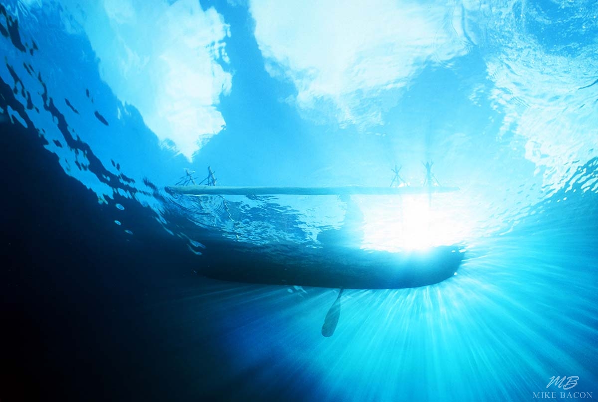 I love this image of the silhouette of a native Papua New Guinea islander passing overhead as he heads out into the open ocean early one morning to fish. He seemed oblivious to my presence underwater and I loved the way the rays of sun light seemed to bounce off his outrigger canoe and penetrate deep into the water towards me. The clouds above balance the image, and the hand carved wooden paddle, in mid stroke, adds another dimension to the photograph that shows how a split second can be the difference in creating a stunning image. I was truly lucky on this day when the angle of light, opportunity, chance and position came together and allowed me to create a truly remarkable image. I love it!