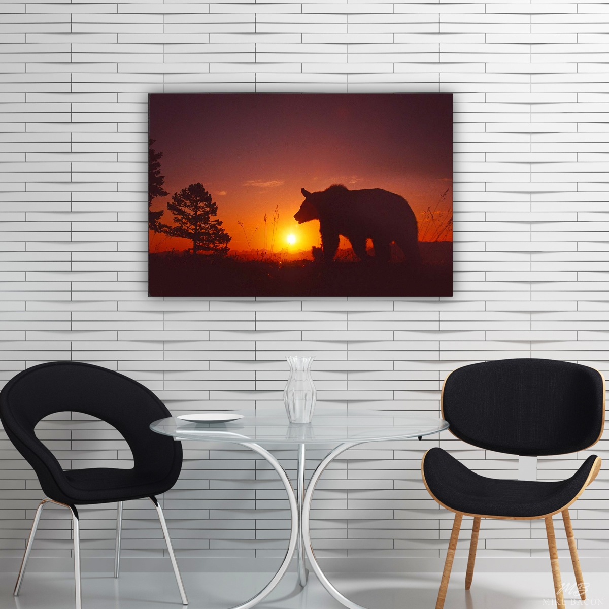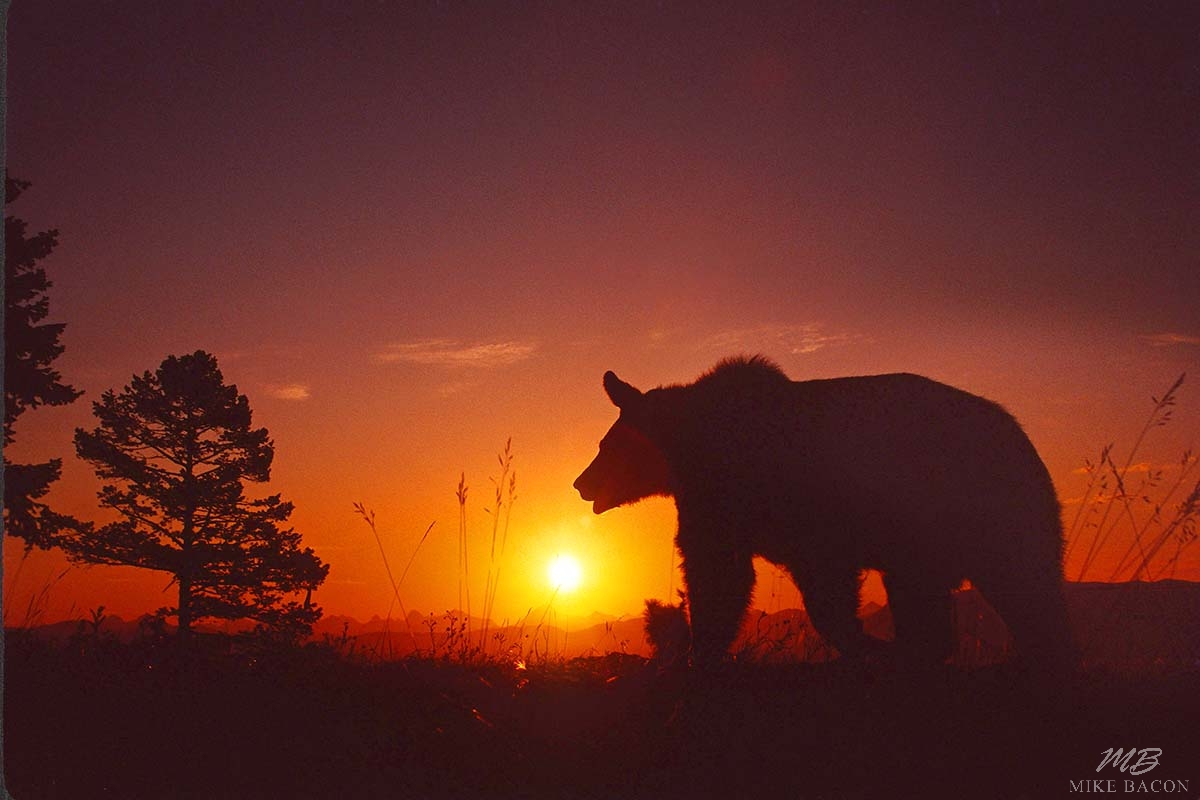 I took this photo of an adult male Grizzly Bear traversing the hiking trail in front of me just as the sun was setting, along a mountain ridge in Yellowstone National Park. As he walked past, I shot off a whole roll of film and this was my favorite image. I love the position of the bear in relation to the sun, wild grasses and pine trees. It was a wonderfully exciting, exhilarating and somewhat nerve racking experience all at the same time! I have to admit I was somewhat nervous on the hike back along the trail to my car in the dark, hoping we wouldn't meet up along the way! The huge hump of muscle above the shoulders of this bear was something I was in awe over. He looked like he could rip a large tree stump right out of the ground if he so wished. Needless to say, I love this image, and appreciated the encounter a whole lot more once I got back safely to the car and was on my way!