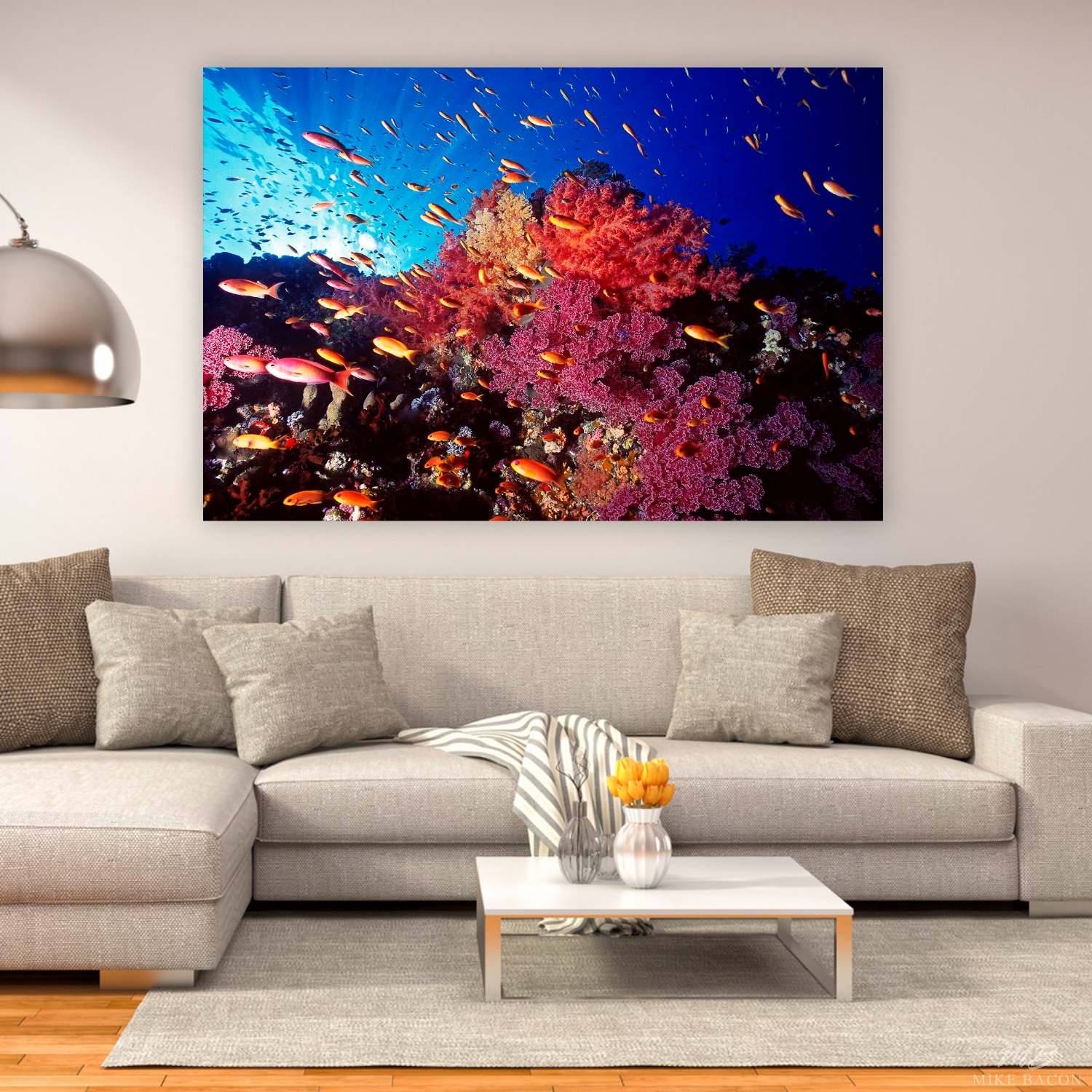 This beautiful photo of the vibrantly colored soft corals and brilliant orange schooling fairy basslets is a great addition to any room! It will lighten up the room and add an air of peace and tranquility at the same time. I took this photo on the north side of an offshore seamount in the Red Sea. This seamount, rising thousands of feet straight up from the bottom, is found hundreds of miles offshore of Egypt. It almost breaks the surface and is known for its incredible abundance of life. There is such competition for living space here that almost every nook and cranny has something living within it or on it. The beautiful blue water with its incredible clarity, and the pastel colors of the reef make this image a great addition to any home!