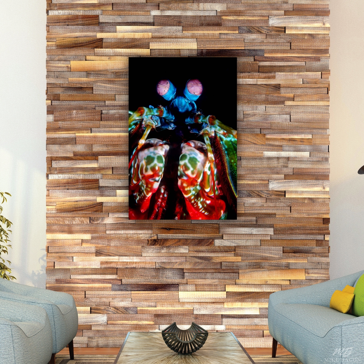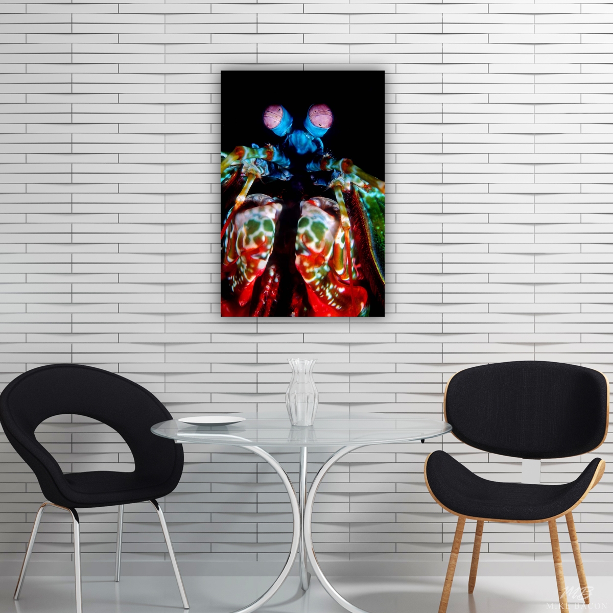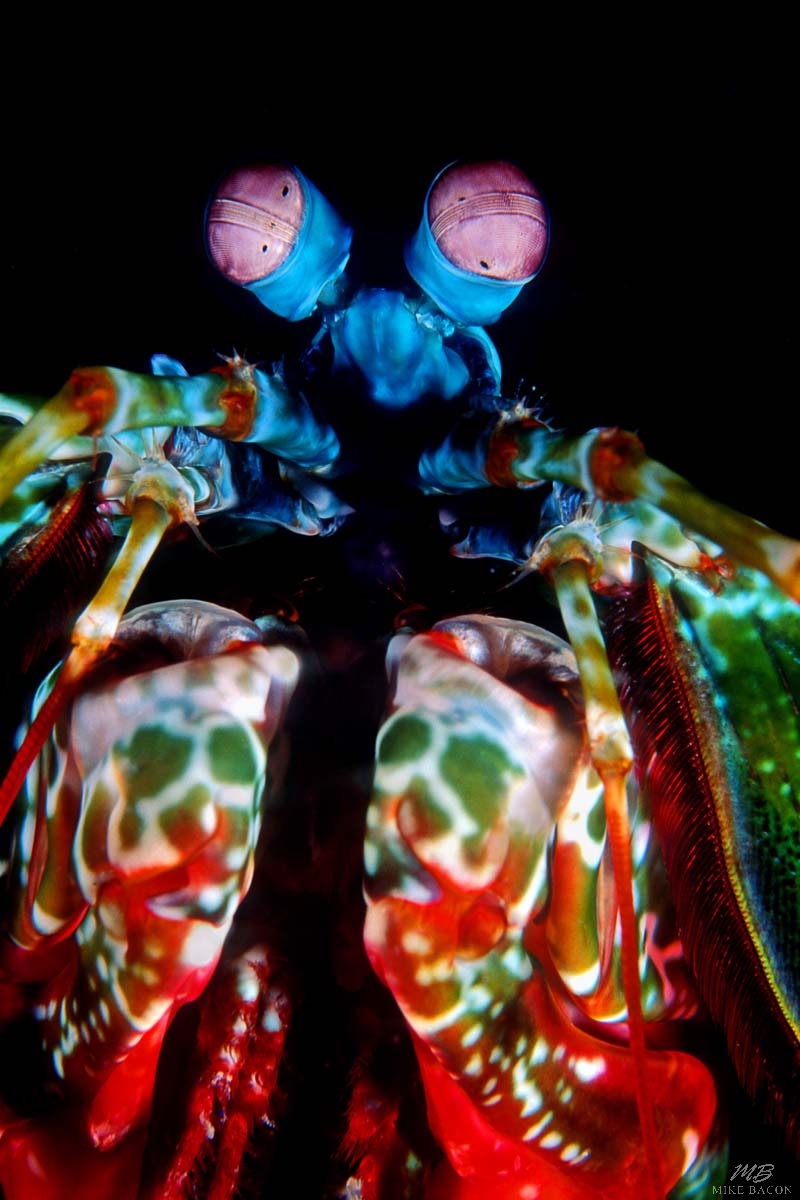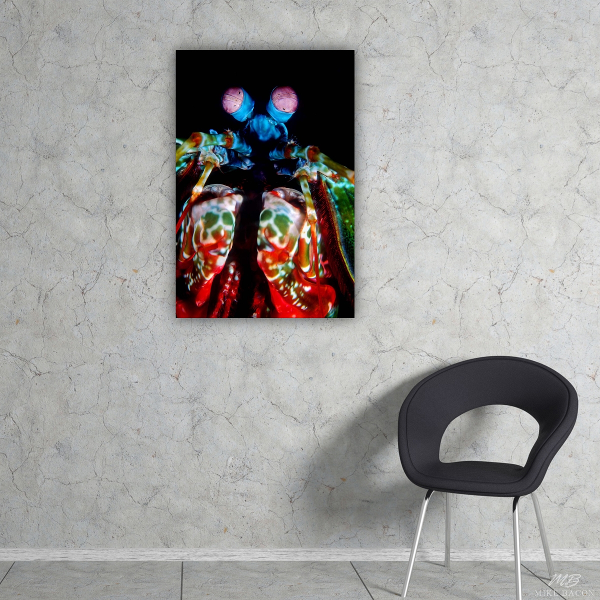 This close-up photo of the face of a Peacock Mantis Shrimp has always fascinated me. I love the colors of the shrimp and the detail in the compound eyes. I took this photo while night diving a shallow reef in Alotau, Papua New Guinea. I spent close to an hour watching this Mantis Shrimp scurry about the bottom in search of prey. Many times it would crawl within an inch of my lens. The Mantis Shrimp uses its front appendages called "dactyl clubs" to pummel its prey. These dactyl clubs can spring forth faster than a 22 caliber bullet and literally causes a shock wave that boils the water. Their vision is unparalleled. The peacock mantis shrimp has the most complex set of eyes in the animal kingdom, with each eye containing 12 photo receptors, in comparison, we typically have 3. This allows them to see the world in a rainbow of colors we can't even comprehend. They are one of the only creatures capable of seeing polarized light and can communicate with each other using colors no other creature can see. They appeared on the scene about 400 million years ago. Needless to say, I love everything about them! To me, this photo looks like the face of a creature from another world. I can't help but stare at it and wonder what its thinking as it looks directly at me with the most penetrating eyes I have ever seen.