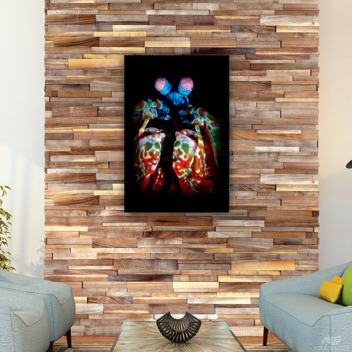 This close-up photo of the face of a Peacock Mantis Shrimp has always fascinated me. I love the colors of the shrimp and the detail in the compound eyes. I took this photo while night diving a shallow reef in Alotau, Papua New Guinea. I spent close to an hour watching this Mantis Shrimp scurry about the bottom in search of prey. Many times it would crawl within an inch of my lens. The Mantis Shrimp uses its front appendages called "dactyl clubs" to pummel its prey. These dactyl clubs can spring forth faster than a 22 caliber bullet and literally causes a shock wave that boils the water. Their vision is unparalleled. The peacock mantis shrimp has the most complex set of eyes in the animal kingdom, with each eye containing 12 photo receptors, in comparison, we typically have 3. This allows them to see the world in a rainbow of colors we can't even comprehend. They are one of the only creatures capable of seeing polarized light and can communicate with each other using colors no other creature can see. They appeared on the scene about 400 million years ago. Needless to say, I love everything about them! To me, this photo looks like the face of a creature from another world. I can't help but stare at it and wonder what its thinking as it looks directly at me with the most penetrating eyes I have ever seen.