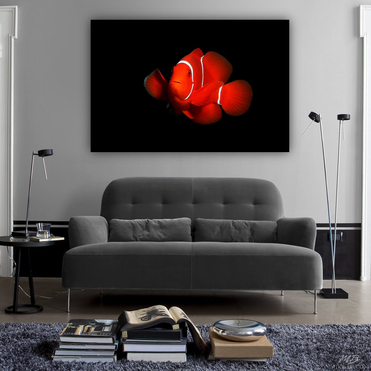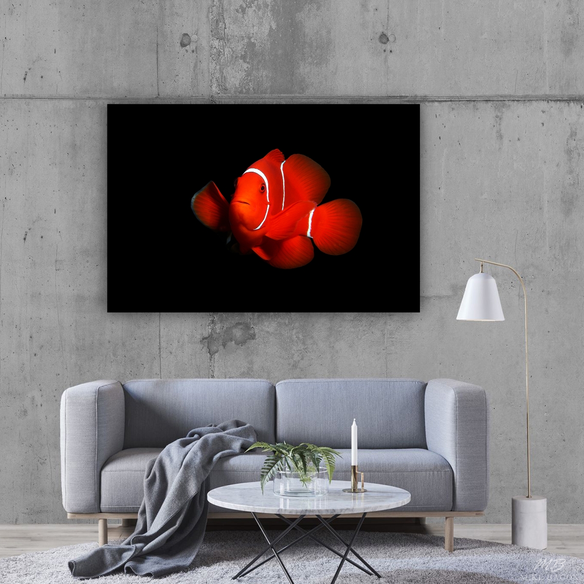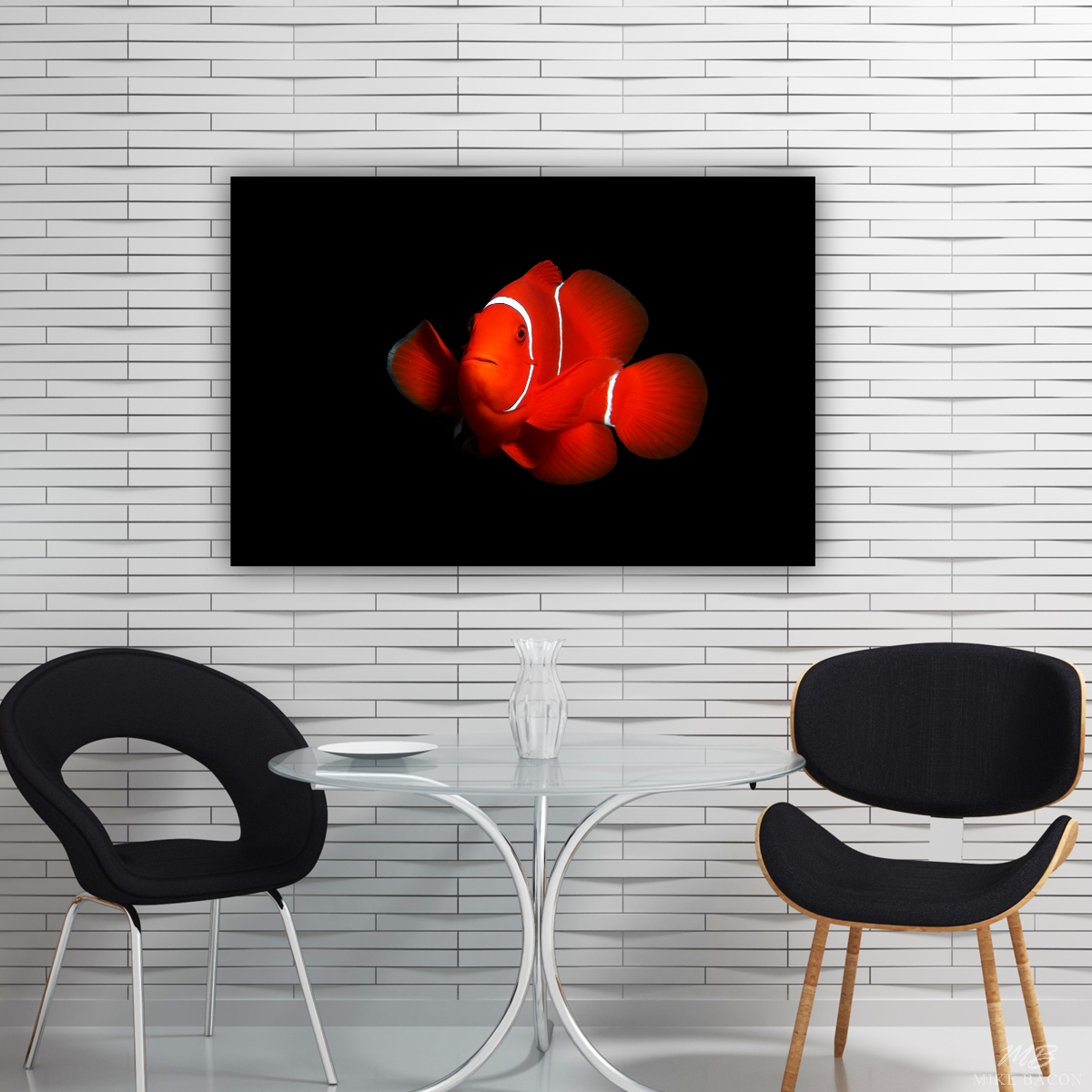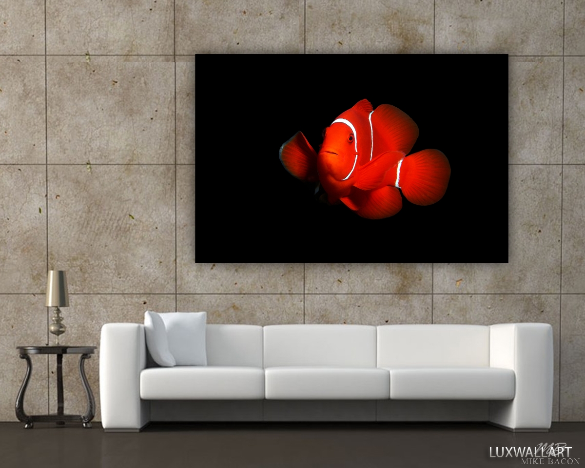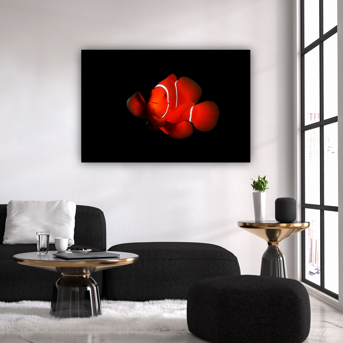 I captured this beautiful photo on a night dive on Marion Reef in the Coral Sea, a few hundred miles Northeast of Queensland Australia. During this dive I came upon a large magnificent anemone that was home to a few dozen Spinecheek Clownfish. They seemed incredibly curious and this one in particular would swim repeatedly right up to the front port of my lens and swim back and forth in the most fluid motion I had ever witnessed. She just seemed to dance magically in front of the lens for minutes on end. I ended up taking the whole roll of film on just her. This image is my favorite photo on the roll and one of my best photos of a spinecheek clownfish I have ever taken. I love the composition of the clownfish, the beautifully open fins and tail, and the seemingly curious expression on her face while she stairs intently right into my lens from just a few inches away. I love the brilliant reddish orange color of the fish surrounded in black. It makes for an incredibly dramatic image that jumps right out at you and grabs your attention. Everything about this image "speaks to me", it is a stunner and looks magical on our wall. I know it will on yours too.