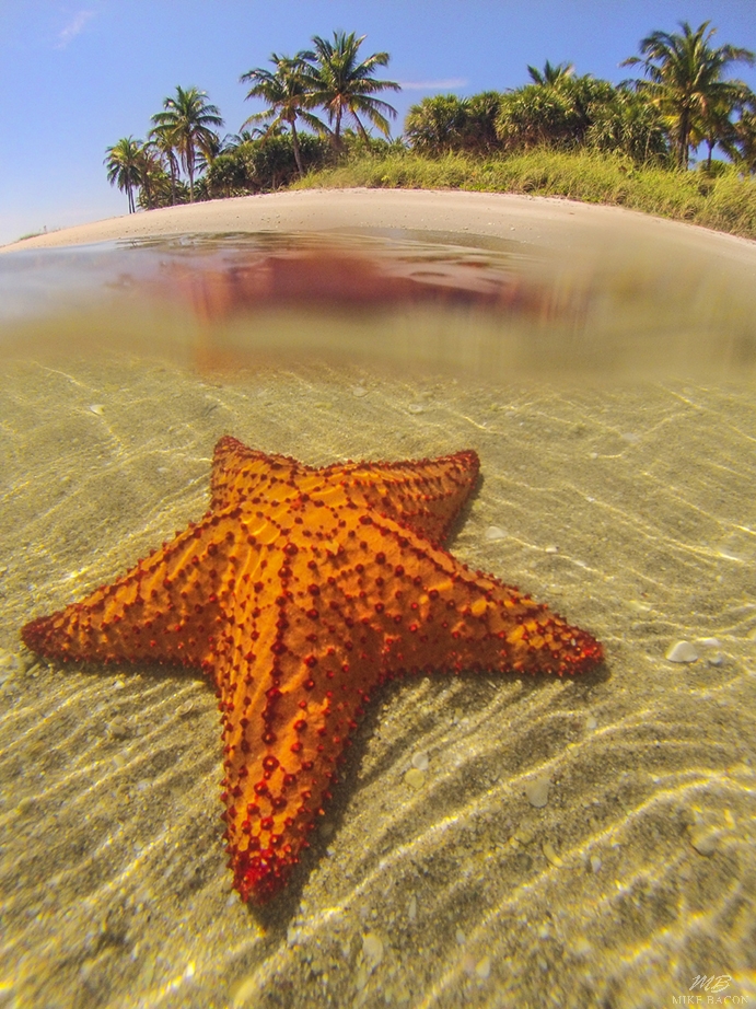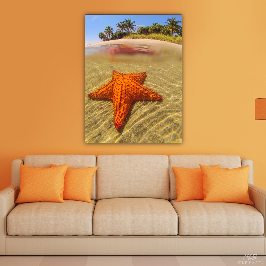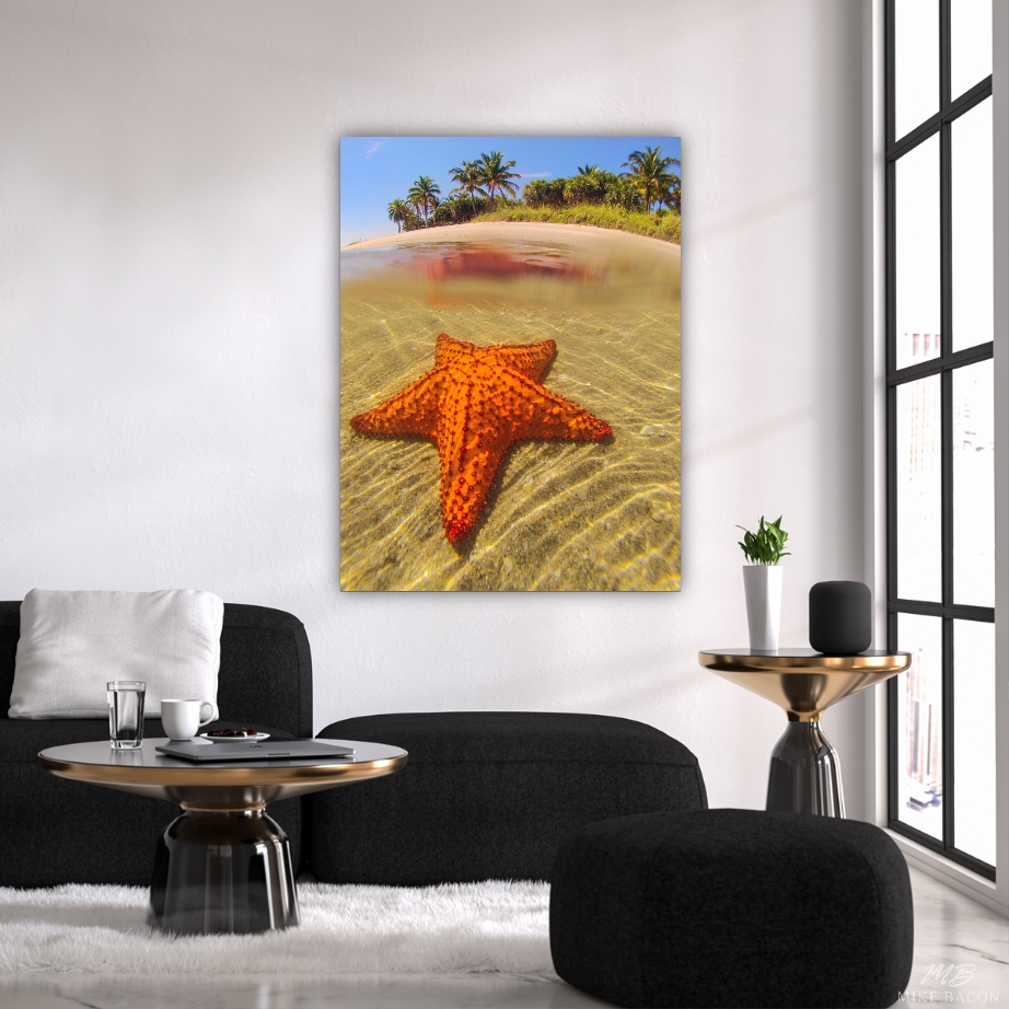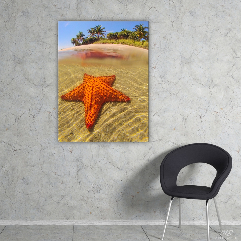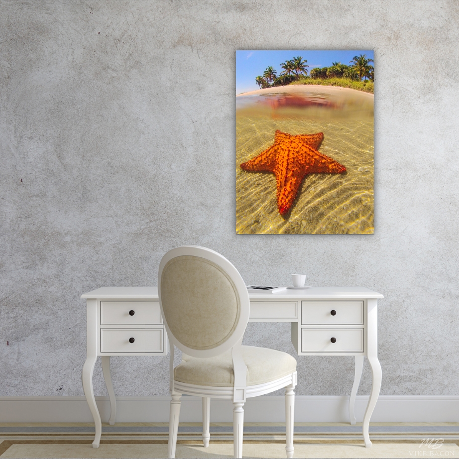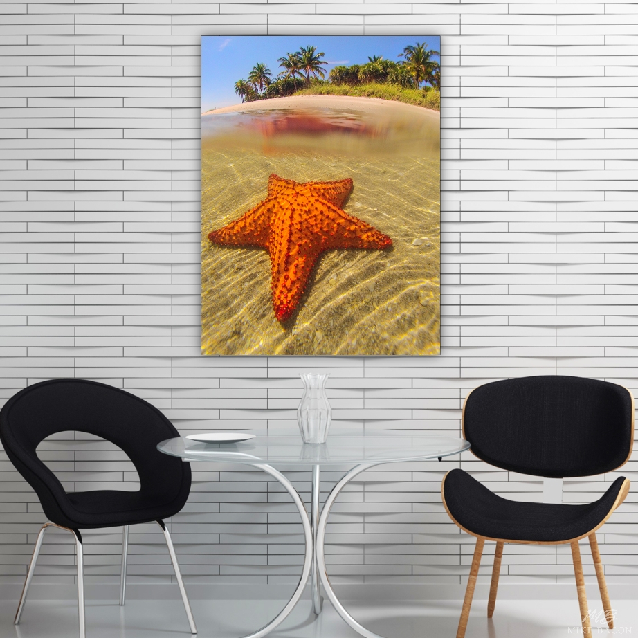 One morning, while leading my AdventureMike's Summer Camp for kids, we came upon a beautiful and extremely large cushion starfish in the shallows by Peanut Island. I loved the contrast of the brilliant red starfish against the shells and sand with the palm trees in the background. Cushion starfish are the largest starfish found in North America and rare enough that they are a protected species here. I took a few quick photos and we continued on, hoping to find another. I love the over/under shot of this image with the starfish reflection on the surface. If you need to add color and a peaceful image to a room, then this is a good choice.