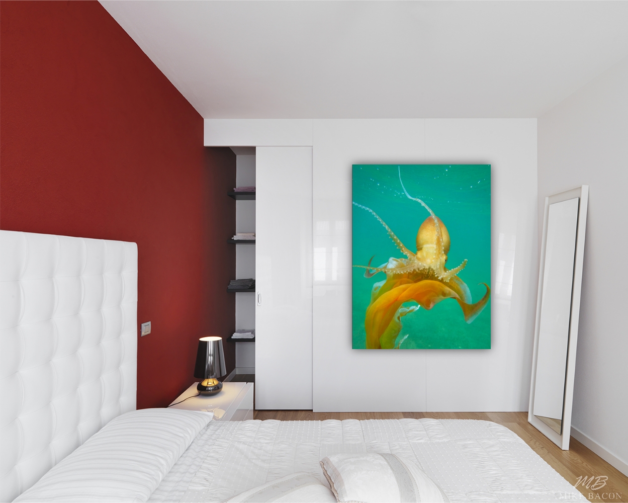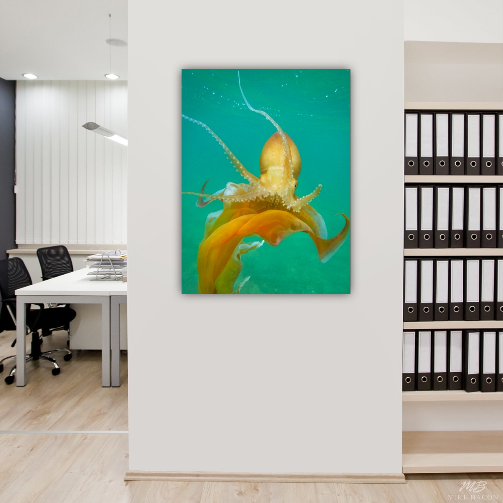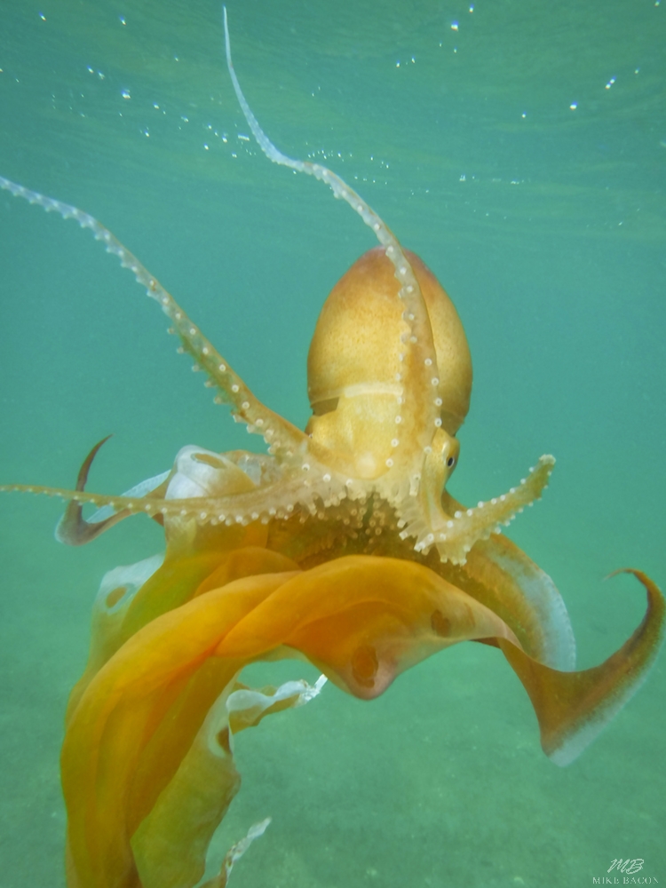 One day last summer, while leading my AdventureMike's summer camp by Peanut Island, we came upon an incredible octopus. The likes of which I had never seen, heard of, or ever saw any photos of in any magazine, ever! It was a tremendously large octopus as octopus go, and swimming freely in the open water column during the day, which is not "normal" octopus behavior. We watched in awe as the octopus slowly glided and swam towards us. I slowly extended my hand towards it, and as it got closer, it gently reached out with a single tentacle, touched my wrist and "stung" the heck out of me. Now I know there is no such thing as a "stinging octopus" and I found this to be quite fascinating and continued to take video and photos non stop. A moment later, it opened up its leading arms and a billowing cape unfolded behind it, 6 to 8 feet in length. If it didn't have our absolute total attention before then, it certainly did now! Once back in the boat I texted a copy of the images I had taken to my "all knowing when it comes to the marine environment friend", Paul Humann, The Marine Fish, Coral and Invertebrate ID Expert. Even he at the time could not identify it. With research, my wife, Sheri, was able to identify it as an extremely rare and very seldom seen "Blanket Octopus". A creature so rare that almost nothing is known of this species and considered by many to be the smartest, naturally occurring, creature in the ocean, even superior to bottle nose dolphin. What scientist do know of this octopus is that it is a "free swimming" open ocean Cephalopod that has learned to protect itself from being eaten by biting and clipping off tentacles of the portuguese man-of-war and attaching them to its body, knowing that anything that touches or tries to eat it will get stung. Thus the sting on my wrist. It also uses longer tentacles of the portuguese man-of-war to "fish with" and capture prey to eat. What an incredibly brilliant thought process! Another fascinating fact is that male blanket octopus grows only to be about 1 inch, while females can grow over 10 feet in length. That's about 170,000 times the size and weight of the males. This species shows the greatest degree of sexual dimorphism of any creature known, and if that isn't reason enough to decorate your wall with the most rare and fascinating creature I have ever seen in my life, then just know, that octopus are "cool" and everybody loves them! Besides, I love the photo, and what a conversation piece you will have once you memorize my story! Haha....