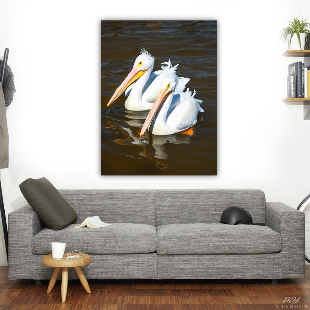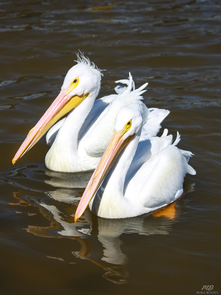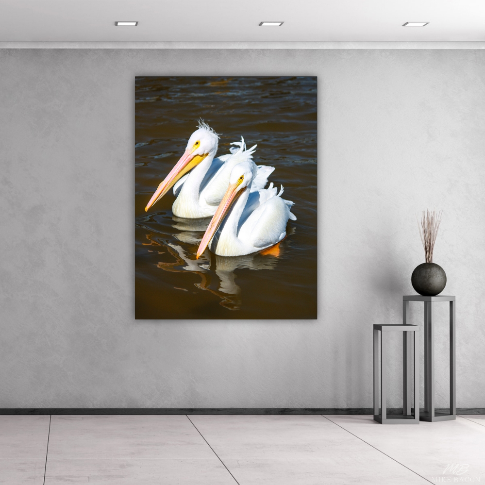 I had been trying for many years to get some nice shots of white pelicans, and this past Fall my efforts and energy finally paid off. To say the least, I am extremely happy with this photo. I love the way a gust of wind blew the feathers up from behind just as I snapped the shutter. The white pelican is one of the largest winged birds in North America and spends most if its life in the northern reaches of Canada. Beginning in early Fall they migrate south to Florida and beyond. During this time it is the breeding season and the feet and bills become a bright pinkish orange. When sexually mature, the white around the eyes turns yellow and the males grow a raised knob on their bills they use in sparring over females. At the end of the season, the knob falls off like a deer antler. They begin to head back north around mid February and early March. One early morning in November while driving up the coast, I saw this tremendous flock of white pelicans land on a nearshore barrier island. When I got to the spot, I pulled over and watched them for over an hour, wishing I had a way to get out there and take photos. I couldn't think of any better option short of swimming and that wasn't going to work carrying some large, expensive and heavy telephoto lenses over my head in salt water. I did consider it though rather seriously! Somewhat discouraged, I got back in my van and continued to drive on, thinking I'm never going to get the opportunity I so desperately wanted. Little did I know then that 2 miles up the road my luck was about to change! I came around a bend and there in front of me, parked along the water was a white van with a couple kayaks on top and a little hand painted sign that said,"kayak rentals". I was in luck! Later that day I was rewarded with this image. If you are a pelican lover like me, than this image is meant for you! I can't help but smile every time I look at it.