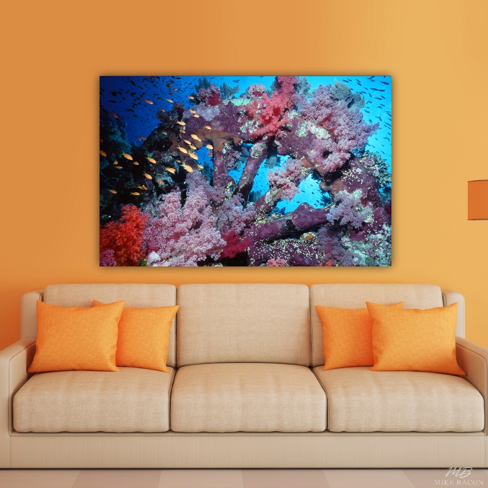 I took this photo of this soft coral encrusted ships wheel surrounded by orange fairy basslets on an incredible reef called Big Brother's island off the coast of Egypt in the Red Sea. This is from a wooden schooner that sunk sometime around the 1890's and was re-discovered in the early 1990's. We were among those first to dive it and I consider this place to be one of my all time favorite dive sites. As multiple ships and schooners sank over the years, the corals grew so fast that they would literally preserve the vessels in a living coral reef. A site to see! It has been sometime since I last was there. I hope it is still the same! This reef is a sea mount that comes up from thousands of feet of water in the very middle of no where. On top of the reef it is about 4 feet in depth, just a short distance to the west of the reef wall it drops off to several thousand feet. The top edge of this reef is covered with tremendous giant anemones with dozens of clownfish, huge brilliant red, purple and pink soft corals and clouds of brilliant red and orange fairy basslets swimming everywhere. It is also home to the largest manta ray, whale shark and oceanic white tip shark I have ever seen in my entire life of diving! The word "Gigunda" came to mind when I saw them and I had just come from the silver banks photographing humpback whales underwater and I was used to seeing BIG things! The rocks just breaking the surface are covered by thousands of clinging, multicolored mud skippers that look straight out of a Dr. Zuess novel, that jump from rock to rock to get away from you. Only fish I've ever seen that jump out of the water to get away, instead of jumping in the water to swim away. Let me sum it up like this, in other words, an underwater photographer and nature lover's paradise! As you swim out over the edge and look down, the incredible clarity with hundreds of feet of visibility makes you feel like you are almost parachuting into the depths. This type of drop off gives "wall diving" a new meaning! And speaking of walls, the peaceful nature of this image, and radiating blue water with the sun in the background, looks perfect in any room, and has an awesome story to go with it!