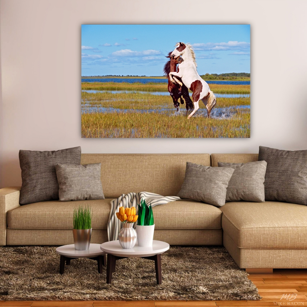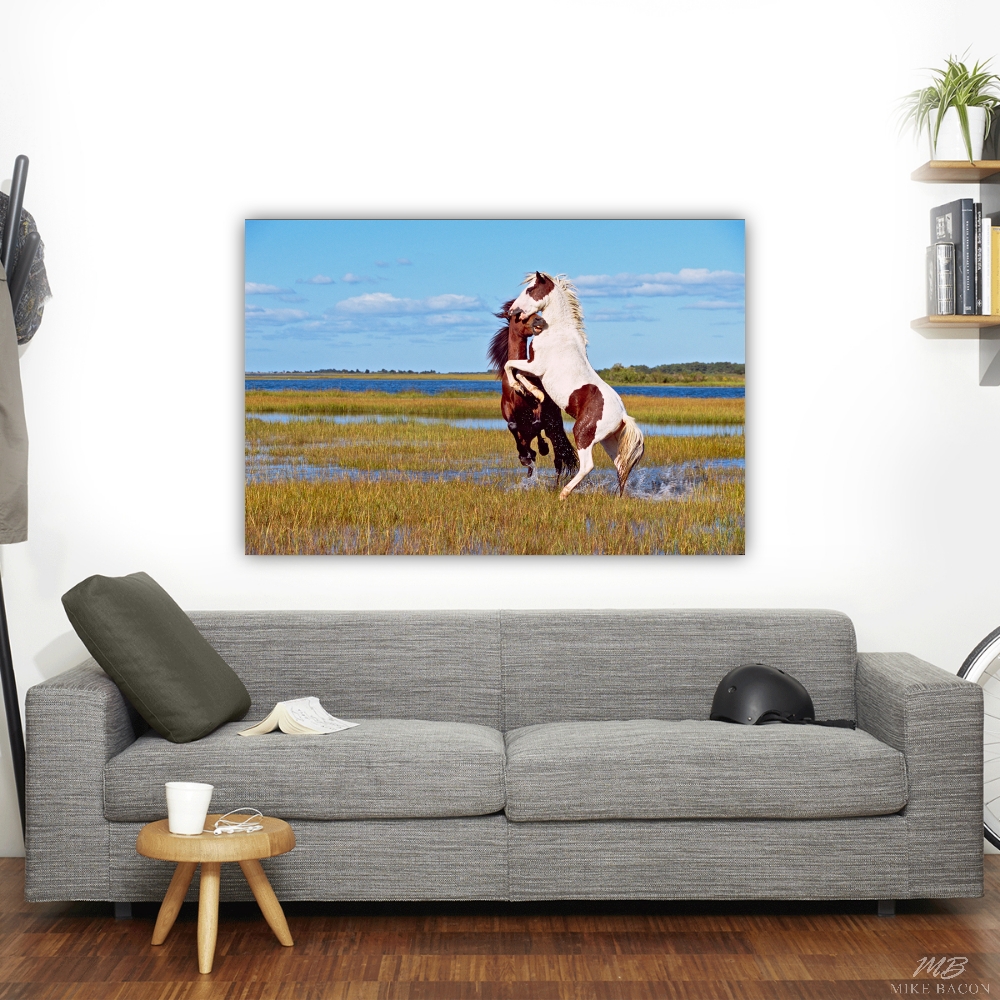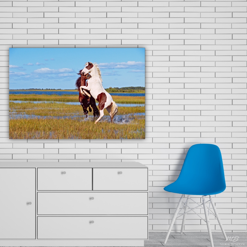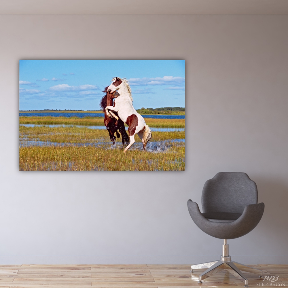 And then one morning I woke to find the skies clear and the wind light, and I hurriedly packed my camera bag and set forth along the grassy marsh to find the Stallions and their mares. An hour later I found both Stallions and their mares grazing along the same stretch of narrow river, separated by only a few hundred yards. Ignoring the nearby sign that said, "No Trespassing, $500.00 fine for approaching horses", I began to move closer. Inside, I could feel that something special was about to happen and I kept my eye glued to the cameras viewfinder.