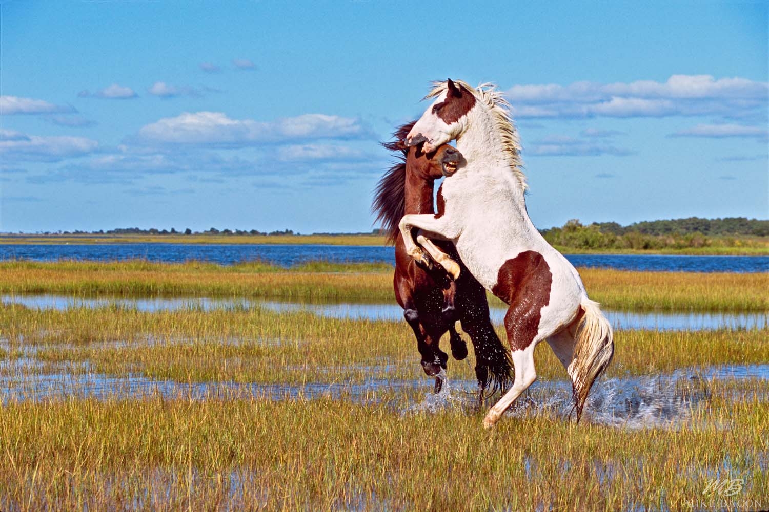The mares paid no attention to this incredible scene taking place before my eyes, and continued to move and graze down river, away from this commotion. In the end, the mares separated back into their original groups and as they moved further down river, were approached by a smaller stallion hoping to take advantage of the situation that was unfolding before me. When he was finally noticed by these two Stallions, they immediately quit fighting and chased him off, rounded up their mares and stood eyeing one another from a short distance apart, neither one approaching the other. It seemed that a draw had been reached. As I stood and watched, realizing what I had just witnessed was a once in a lifetime experience, I noticed a quick flash of sunlight reflecting from my left and realized a ranger had witnessed the whole thing and was watching me thru binoculars. Later that night when I finally arrived at my tent, I found the ranger waiting for me and I expected to receive the fine. When he asked if I was the photographer that was out there and I said I was, his exact words to me were, " I hope you captured that on film because you don't realize what you just saw. I have been here for 23 years and I have never seen stallions fight like that before". Then he mentioned that he could give me a fine for trespassing and I told him that I would happily make him some prints and send them to him if he didn't, and the deal was struck.